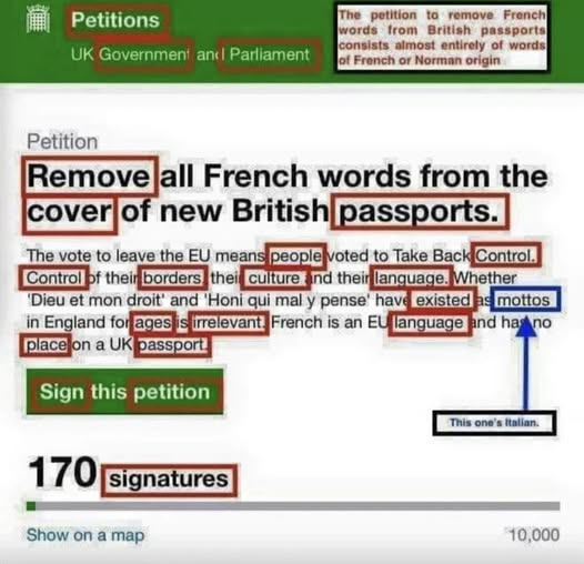 >>753092 Bidding UK Kin-Rikedom and Folksmoot The prayer to do away with French words from British stow-writs is made of words of French or Norman root almost wholly. We ask you to take all French words from the lid of new British stow-writs. The vote to leave the EU means folk voted to Take Back Rule. Rule of their land-bounds, their ways, and their tongue. Whether 'God and my right' and 'Evil to him who evil thinks' have been sayings in England for ages is of no mind. French is an EU tongue and has no place on a UK stow-writ.
