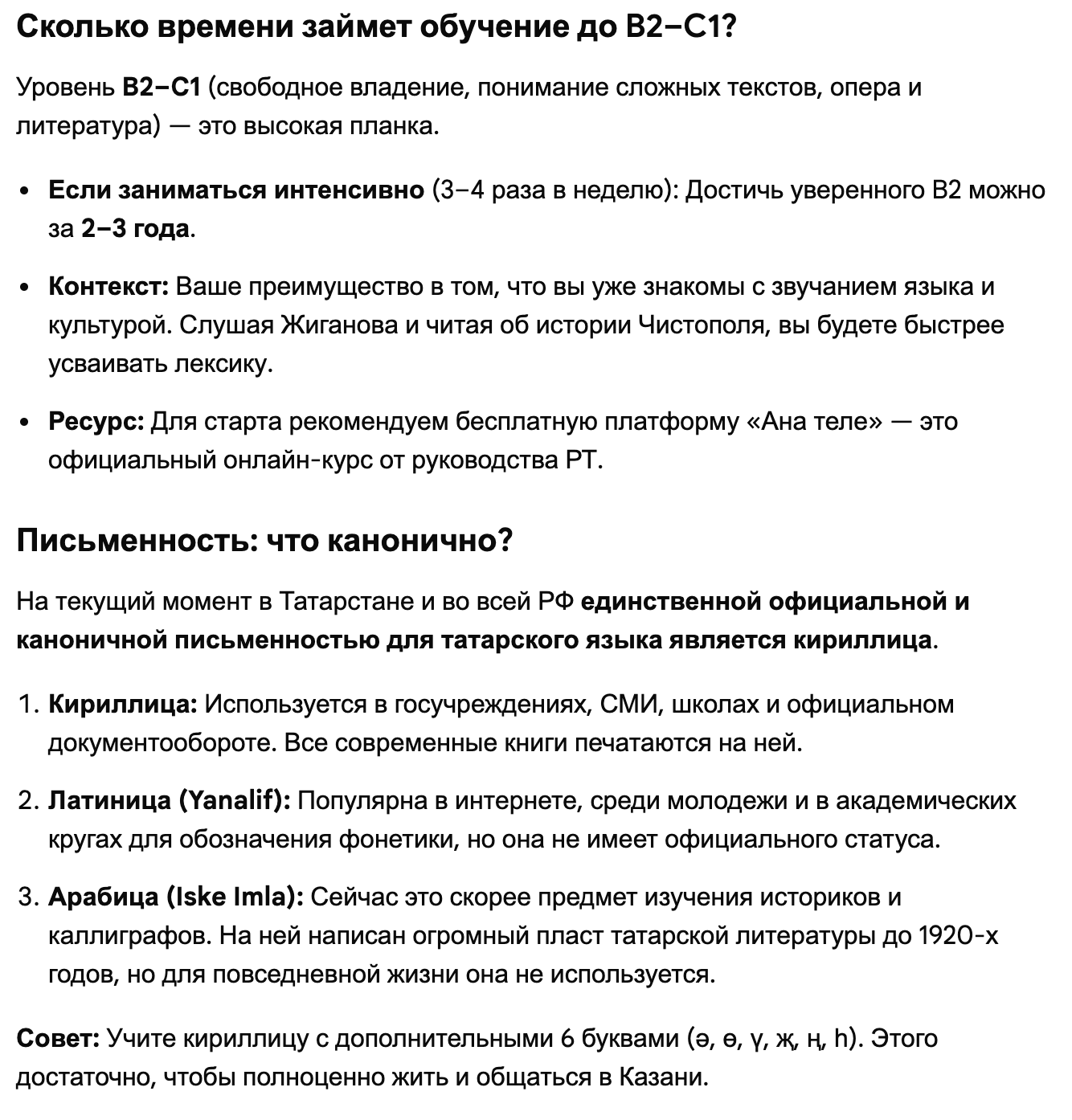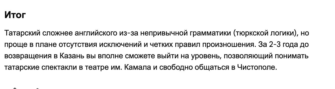 А насколько сложен татарский по-сравнению с другими языками? Всю жизнь прожил в татарстане (кроме последних 2ух лет), обучали ему в школе (в семье татарского никто не знает, все русские по национальности) - но всё что усвоил, это пару стандартных фраз. Через 2-3 года планирую вернуться в Казань и как-то на фоне тоски по родному региону углубился в татарскую культуру, начал слушать музыку Назиба Жиганова и узнавать об истории родного Чистополя и захотелось и язык выучить - насколько сложно будет это сделать, сколько времени понадобится чтобы заговорить на уровне B2-C1 (Если сравнивать с английским, который единственный мой иностранный язык во владении). И да, вопрос - а какая письменность сейчас для татарского канонична - арабская, кириллица или латиница (в мои школьные годы была кириллица, но вроде там постоянно какой-то кипиш на этот счёт идёт)