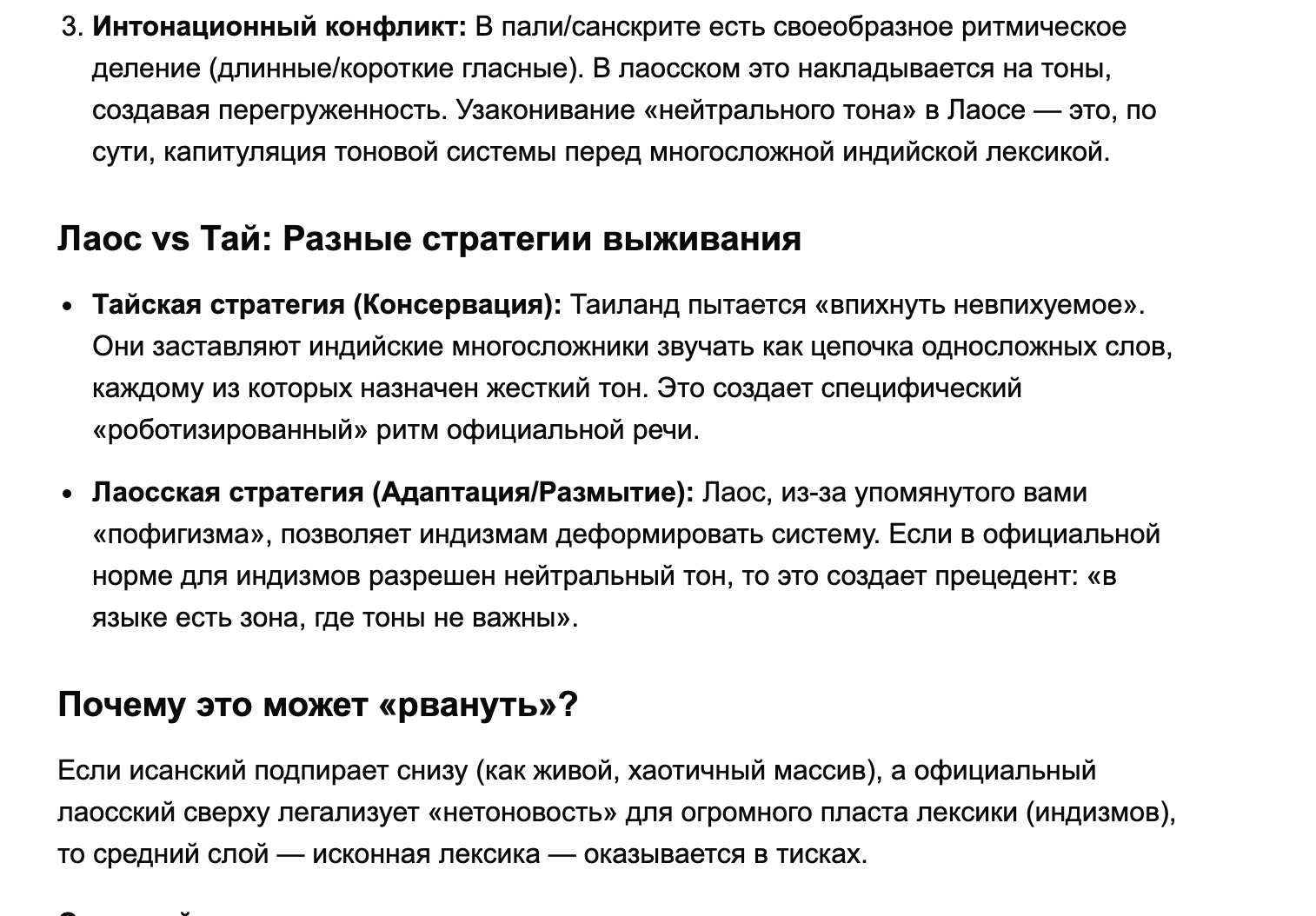Может ли лаосский стать пост-тоновым?? Если в Тае довление нормы с чёткой регламентацией тонов в официальной сфере ну очевидно, то в мыанг-Лао совсем нет. Опорных тоновых систем и то не одна, а реальное произношение вообще разное. Даже в нашумевших мидовских учебниках система и нумерация слегка ад-хоковая. Что, теоретически, должно означать чуть больший пофигизм к тонам, раз и чуть большее умение вслушиваться в сами звуки без супрасегметщины, это два.