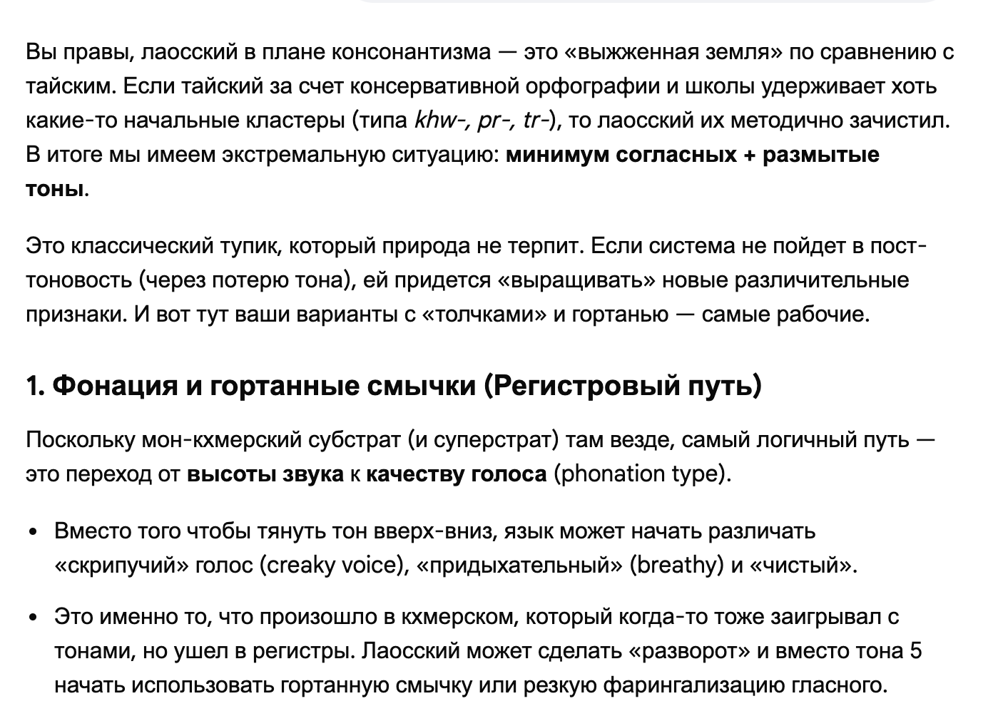 Кстати, вот ещё прикорм робачу. Лаосский (из крупных) самый консонанто-бедный в регионе. Начальных сочетаний, даже как в консервативно-тайском, там тоже не осталось. Так что видимо, путь только в гласные или какие-нить гортанные смычки, толчки и хзч.