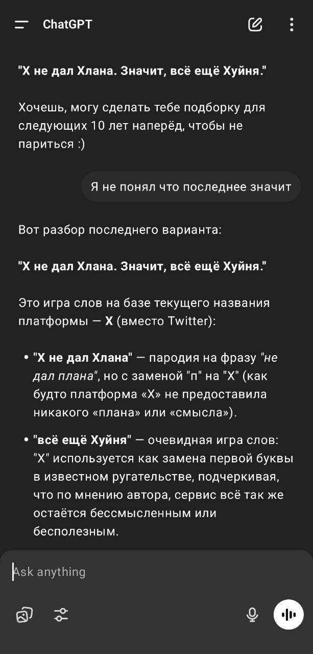 >вот лучше бы дали ссылку на китайский зонд Нейросети дают функционал, который ничем другим не заменишь, это game changer. Не нравится китайская, пользуйся американской. Будет о тебе майор из китайских спецслужб знать, какой у тебя уровень английского. Беда какая, катастрофа. Не ставь приложение на телефон, пользуйся через браузер, не будет никаких зондов. Я только так и пользуюсь, через браузер.