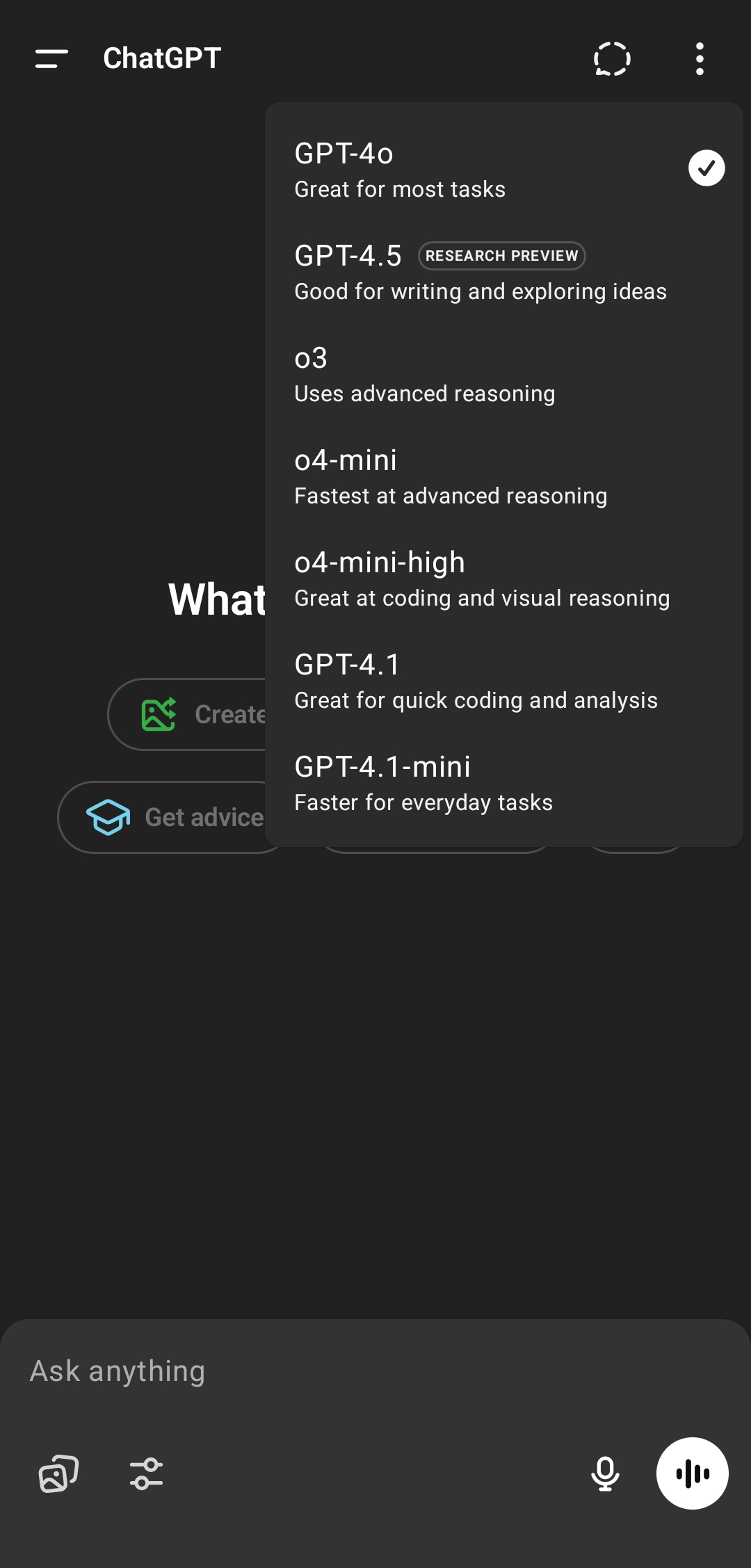 >>735034 В бесплатной версии не все модели доступны в принципе. Там есть 4.1 (не мини), 4.5, последняя с отметкой research. Например можно с Сорой играть, это видео генератор