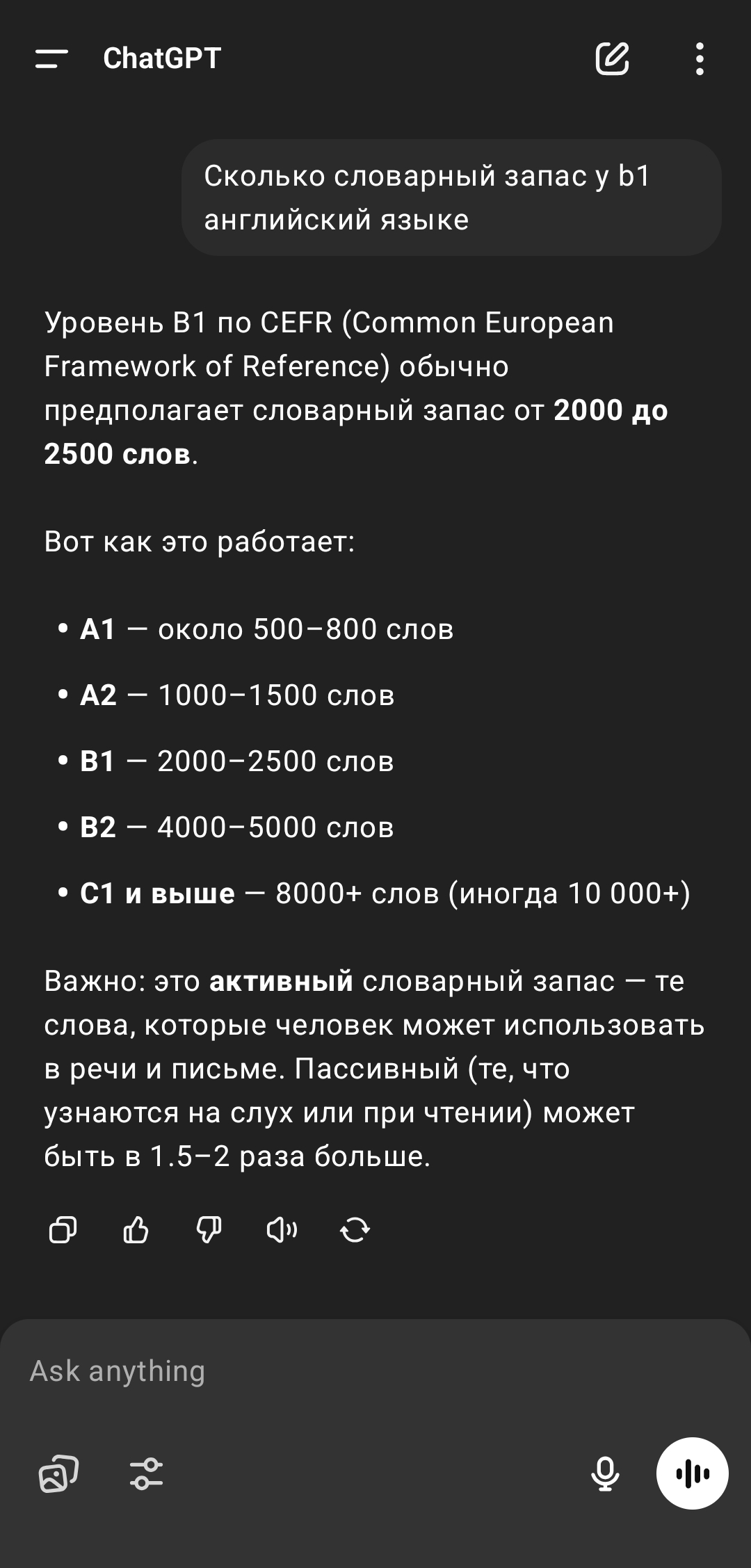 >но если ты не балакаешь ни с кем, не ведешь переписку с кем то (на англ офк) то ты и фактически В1 не станешь Короче, мой посыл такой. А1, А2, Б1 если мы говорим о том как это понимают при получении сертификата, то достичь его можно вообще не взаимодействуя с живыми людьми. Просто по учебникам и записывая самого себя на диктофон. Б2- сложно, но ультра задрот осилит. С1 - да. уже нужно реальное общение и реальная практика языка.