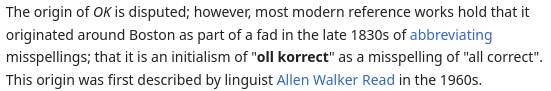 как же я ненавижу слово ОК. какой-то бред, нахуй это слово использовать в письме, это как если бы в русском писали норм. вот именно так. откуда это вообще пошло? 100% какая-то хуета типа all cool или что-то такое и произносится как oll kool потому и OK. ну там ричард пенис вилл бил знаете шиза ебаная.