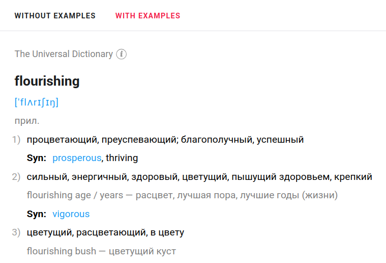 >>746562 >Скажу, что читая у меня краше играет образность, чем будь это однословный перевод англ-русс не надо однострочный, в русских словарях тоже есть примеры фраз, обязательно надо их смотреть, чтобы лучше понять слово. Вот пример русского словаря и английского