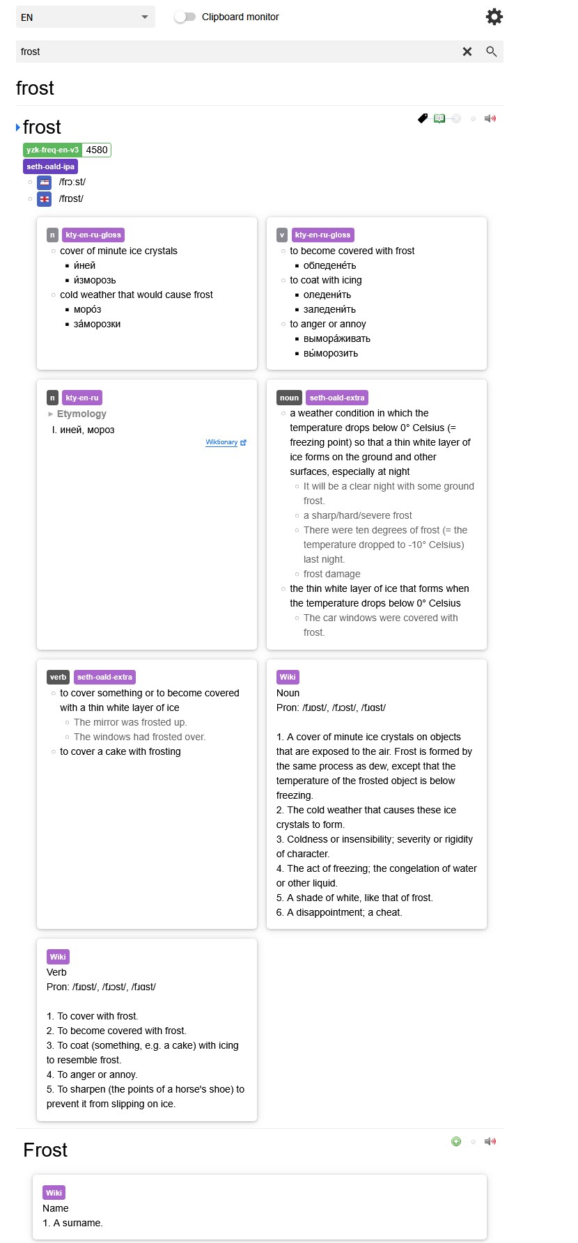 >>746576 В чём громоздко? При скане слова окно будет 500 на 500 пикселей или сколько ты настроишь, а не во весь экран, хочешь только переводы - можно убрать словари со значениями или просто не смотреть в них >>746579 Так я тебе не говорил что у слова set 3-4 значения, имел ввиду что гораздо меньше, чем 1000, как ты писал >>746590 Собираешь читать и выдумывать смысл/перевод в голове или что?