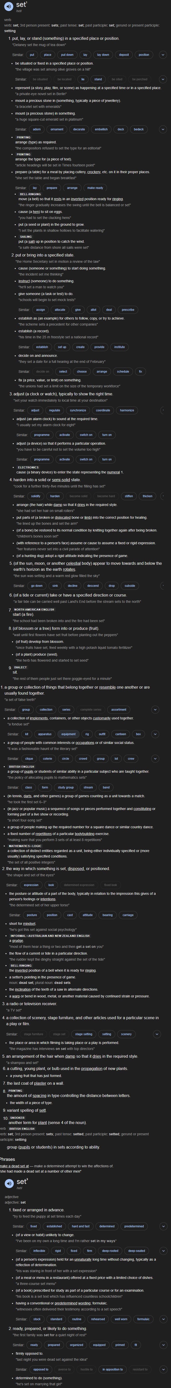 >>746579 У тебя на картинке всего четыре значения. Набор, установить, установка, установленный. И вся эта стена текста это просто буквальные и фигуральные применения set с этими значениями. Если хочешь вызубрить все это полотно, вместо того чтобы научиться понимать язык, то флаг тебе в руки.