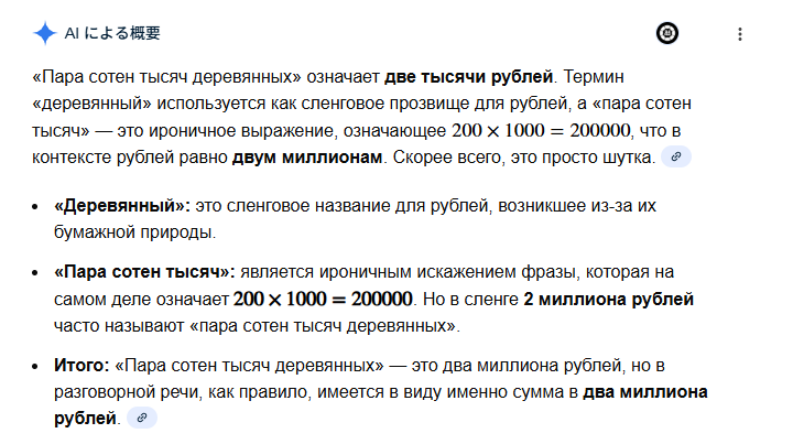 >>749361 >>749359 >>749353 Жесть вы заовнили челика по невнимательности. Ему вон нейросеть херню написала, он решил, что речь про 2 мульта. >>749351 Двести тысяч деревянных это 200к рублей.