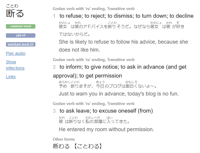 >>749904 Во втором пункте написаны значения спросить/получить разрешение. Соответственно, как 連用修飾 в отрицательном виде это будет сделать что-то без разрешения. В третьем пункте написано уйти откуда-то (退出・辞退・辞去). В примере под третьим пунктом написано вошёл без разрешения, то есть, как во втором пункте, а не как в третьем.