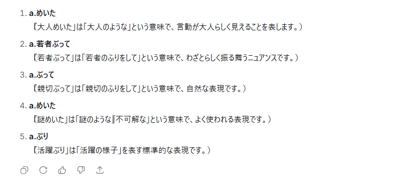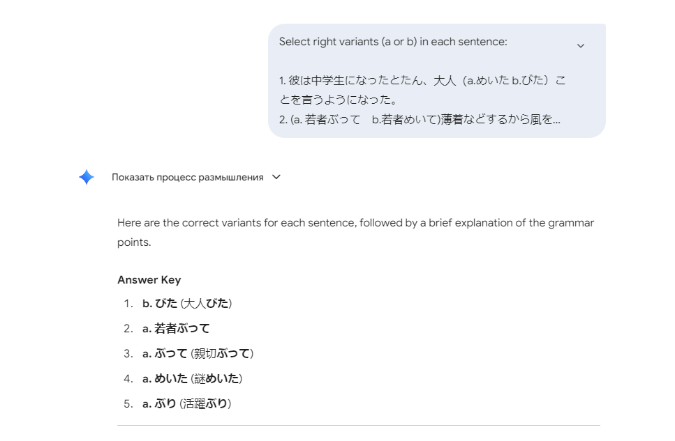 >>750063 > Открой книжку типа Nihongo Sou Matome N1 Bunpou и задай вопрос на грамматику оттуда, потом сравни с ответом с конца книжки. Увидишь наглядно, как часты обсеры. Скачал эту книжку, открыл рандомную страницу в середине и переписал оттуда первое попавшееся задание в чат жпт, и он там сразу же обосрался.