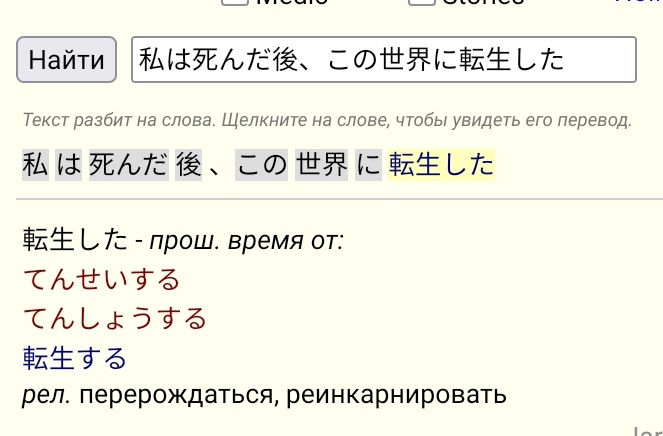 Естественно нихуя не понятно, по этому каждое слово из тайтла отдельно в гугл - мол выдай мне пример. Собственно это был пример который мне гугол выдал на запрос "転生 example sentence" - но я начал подозревать что это предложение сгенерированное нейронкой, так как я не знал что 死 тут это глагол и с моей точки зрения 私は死 выглядело как хуйня кроч, спасибо в общем.