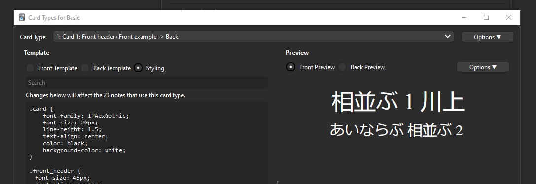 >>751147 >Ещё вроде можно в разметке карточек в хтмл обернуть всё в div с свойством, форсирующим внутри японский, но точно не помню как там было. Это пробовал, не сработало.