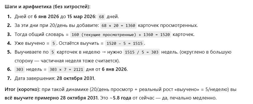 >в итоге гора растёт в геометрической прогрессии На среднесрочной дистанции нормально ожидать примерно 10х повторений в день от числа новых карточек в день.