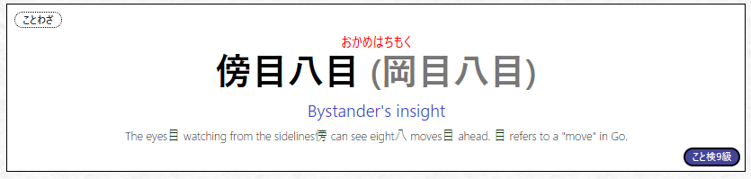 >>751717 Заучивание устойчивых выражений ускоряет их понимание во время потребления контента, т.к. не надо на лету собирать смысл из отдельных слов, что особенно важно с озвучкой без субтитров чтобы не отставать. И снижает вероятность не узнать выражение когда нет кандзей (озвучка без субтитров или просто если каной написали).