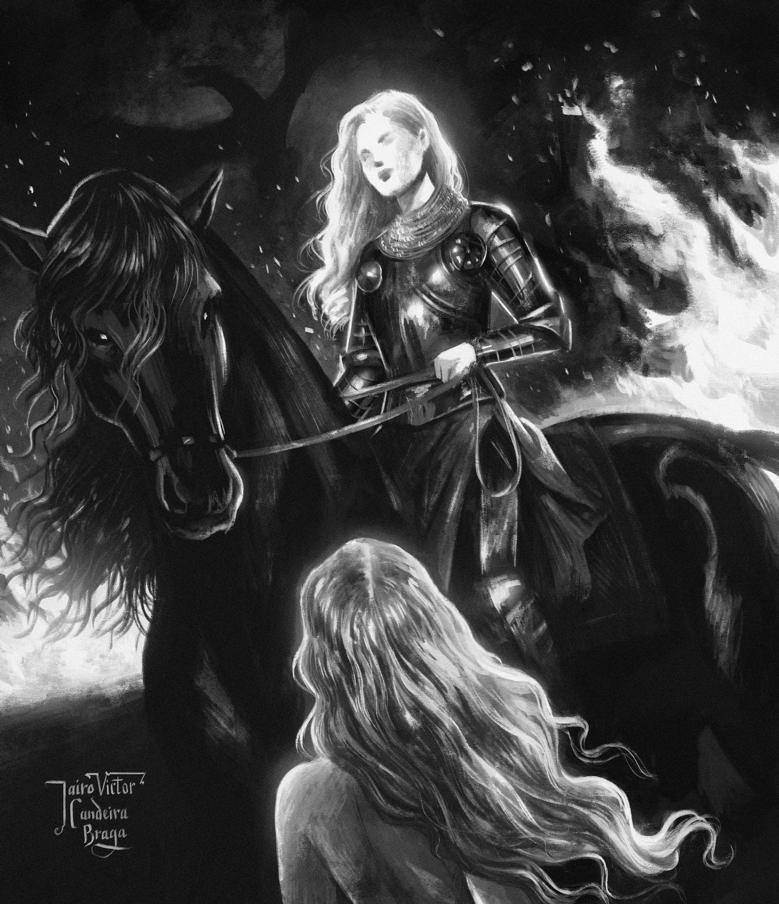 Она увидела, как черноволосый мальчик становится черноволосым мужчиной – и он воссел на горе костей в круге огня. На его коленях лежал серый меч: серый меч, который никогда не вкладывали в ножны; серый меч, помеченный одной серебряной буквой. Его рассеченные шрамом губы шевельнулись, и он заговорил, но его слова были каплями крови, которые собрались в ручей, который стал рекой, которая превратилась в море, которое прихлынуло к берегам Севера. Кровавый прилив. Потоп, чьи красные воды не отступят никогда.
