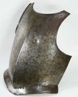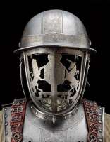 >смотровые щели выполнялись на лбу с таким расчётом, чтобы при копейной сшибке, когда всадник наклоняется вперёд, он имел хороший обзор, а в момент сшибки, при выпрямлении, копье противника встречало бы перед собой глухую стену из стали, полностью исключая попадание в щели для глаз