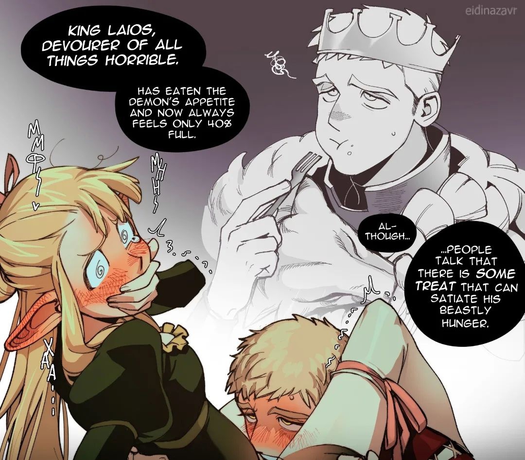 >>566810 >>566811 >>566812 >>566813 Я где-то тут на фэнтезяче видел пикчу с Лайосом и Марсиль, где Лайос ест пирожок Марсиль и где говорится про то что он на 40% голодный и только это может удовлетворить его.