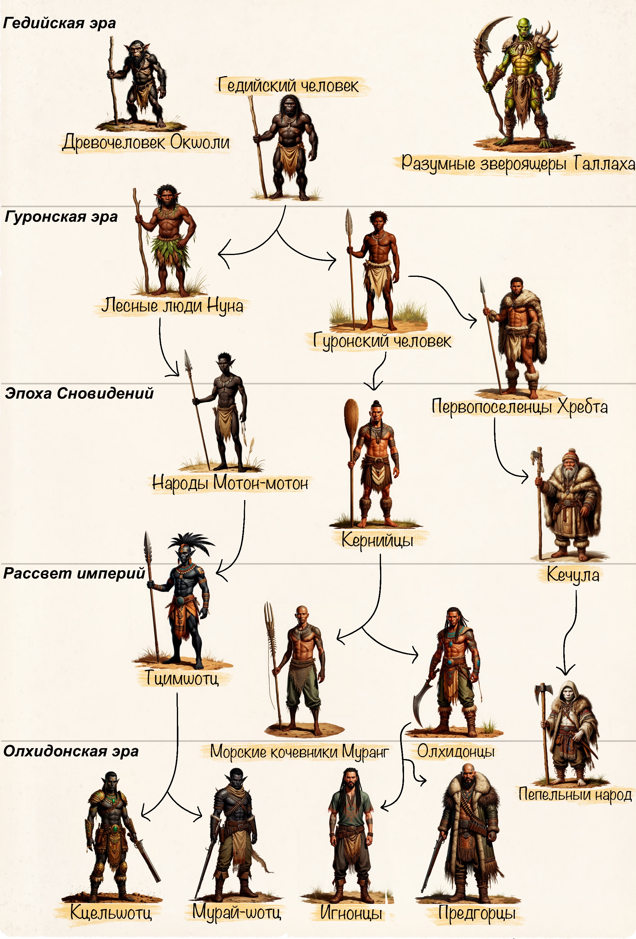 >>589041 У меня они ближе к ацтекам. Строят пирамиды из чёрного камня, приносят жертвы, ненавидят людей. Хотя физически от людей отличаются мало — живут столько же, никакой магией не обладают. На каком-то этапе развития сеттинга люди были практически истреблены и изгнаны с континента на архипелаги (кроме живущих в горах пепельников и не указанных в схеме сетиан, до них эльфы не добрались), где основали цивилизацию морских кочевников, типа гавайцев. Но затем вернулись и покорили большую часть материка в период одной из глобальных катастроф, когда эльфийские империи были раздроблены междоусобицами, и нападения с моря никто не ожидал.