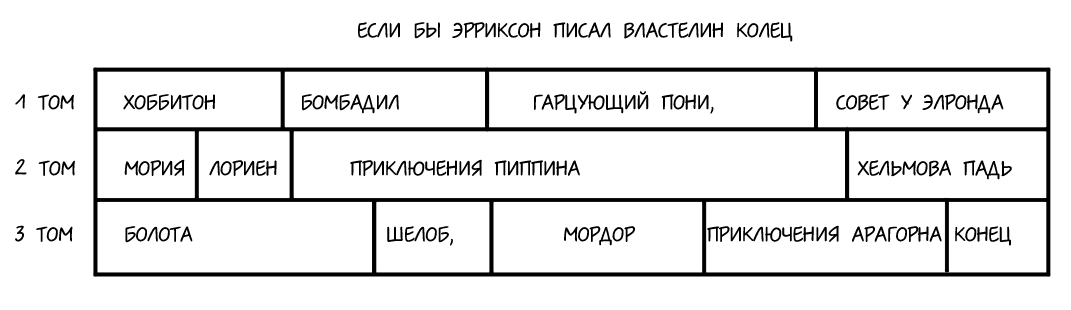 >>540488 У Эриксона дохера занято пустым трепом и размышлизмами, а интересные события поданы как кек-пук-случилось. Ну прикинь про Пиппина не две-три главы, а половина второго тома. Без новых событий, а всё то же, только растянуто. С перебранкой орков, чтобы энты там пердели-кряхтели про древние времена и упадок. А про Хельмову Падь пару коротких глав, как в финале четвертой книги. Ладно, как-то не удалось. Вчера смешнее казалось.