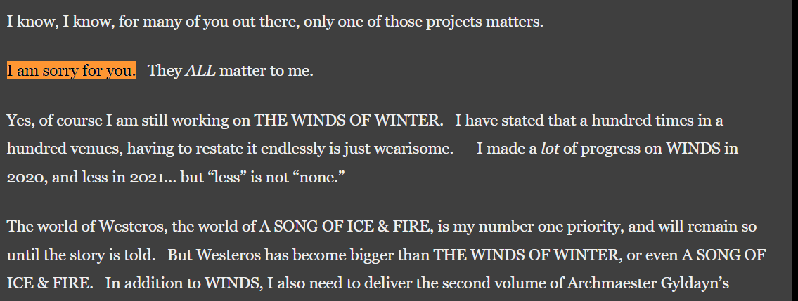 Да и Мартин походу хочет тупо писать мелкие рассказы как в старые добрые, это объясняет ностальгические нытье в этом году и обещание о продолжении рассказа по которому фильм сняли с Миллой Йовович