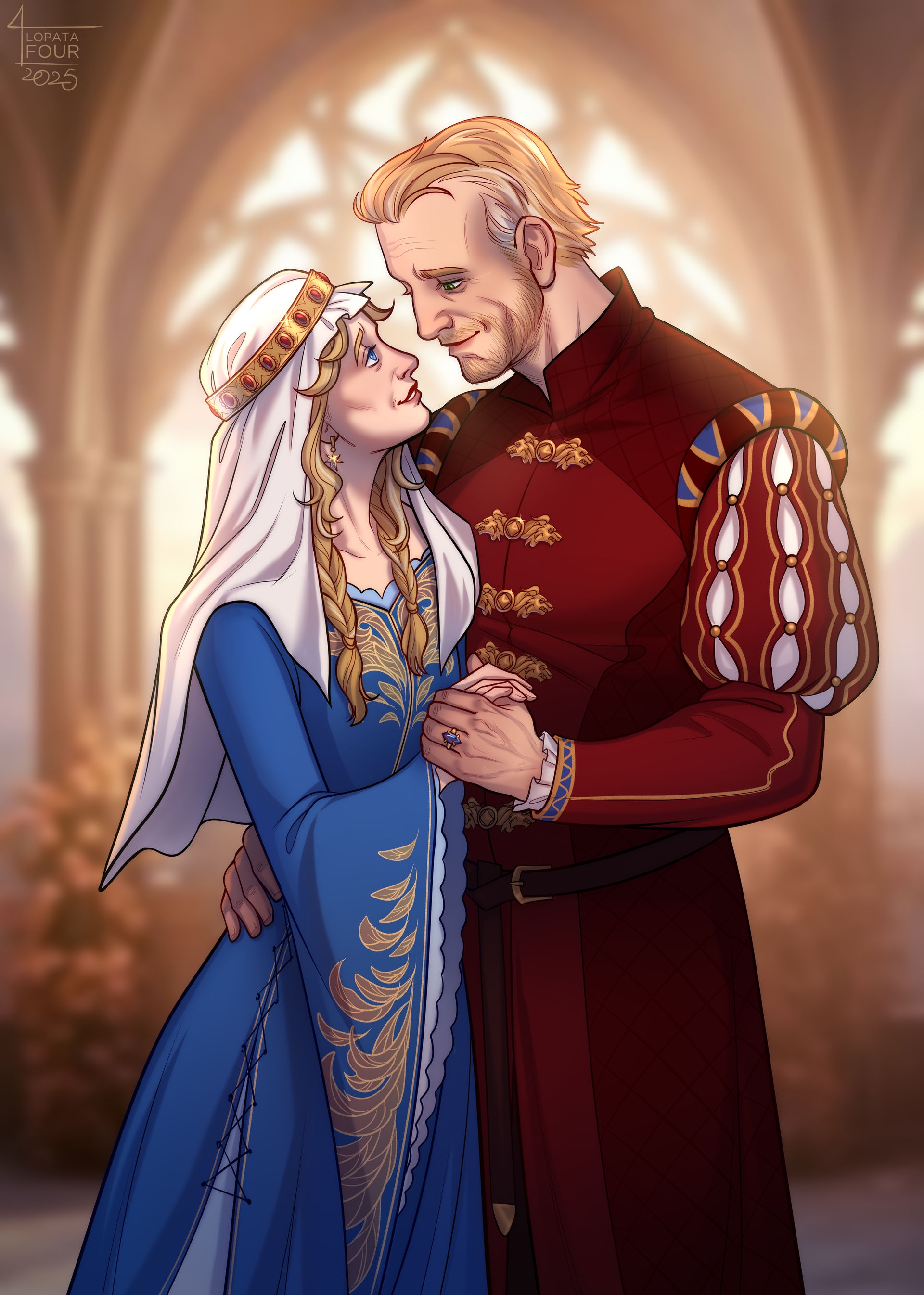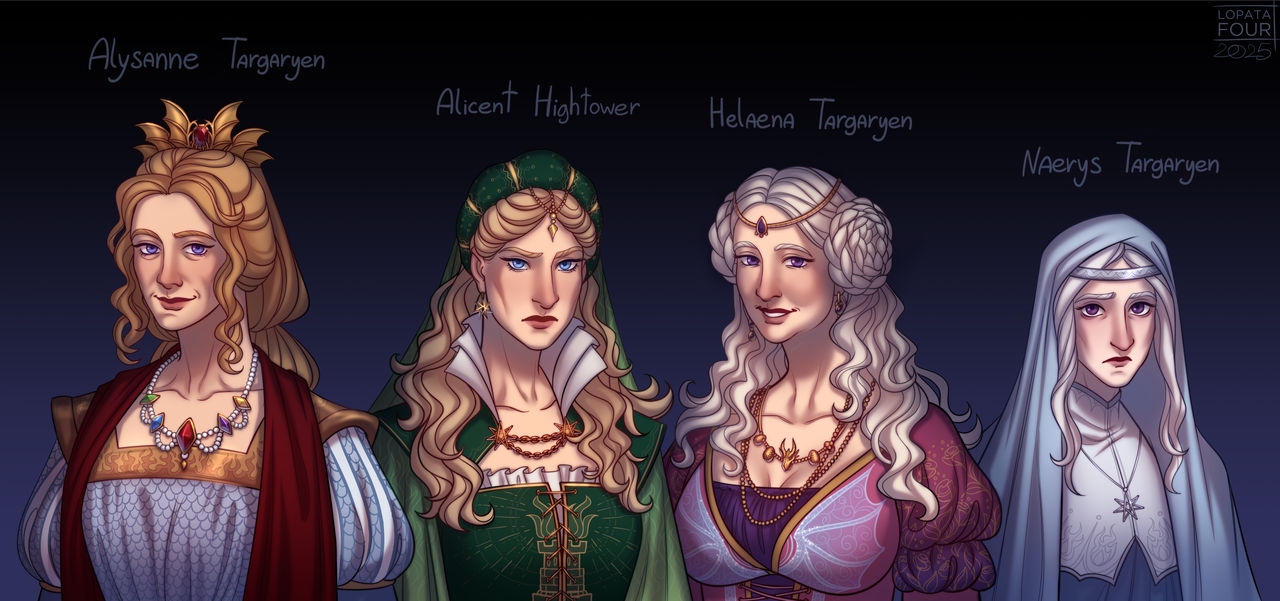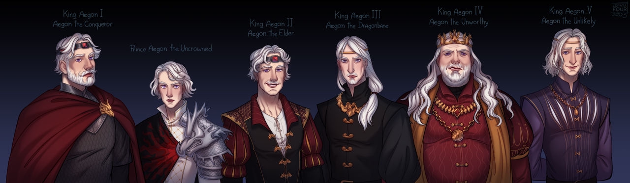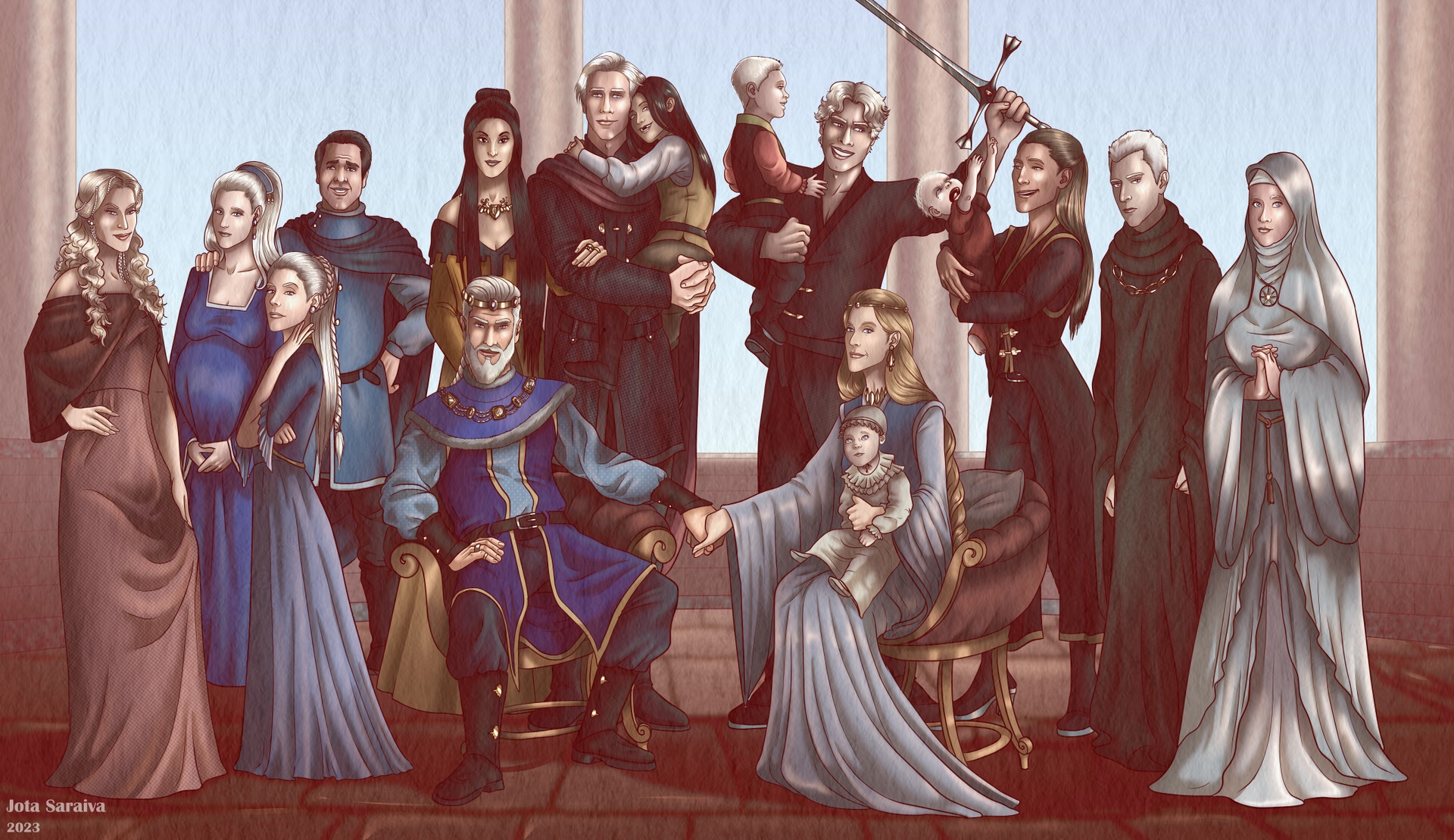 Милый арт золотого времени Таргариенов: Джейхерис старый король с семьей. Самая яркая часть расписанного Мартиным древа Таргариенов. Но это у него руки еще не дошли выпустить вторую часть ПиК, где должен появиться толстый троллль, лжец и абсолютно точно недевственник - Эйгон 4й. Итак, кто есть кто в этом мире... Сидят: Король Джейхерис с королевой Алисанной, у которой на руках младшая из принцесс - Гаель. Дальше стоящие, слева-направо: Блядовитая принцесса Сейра, c челюстью Ксении Собчак, что не хотели быть "всего лишь" одной из принцесс, а хотела быть королевой чего угодно. Что бы предложили, сразу же согласилась бы. Важен был статус. Бухала с 11 лет. Сбежала от пострига в септы работать шлюхой в Волантис. Собственно, как бы это не было парадоксально, единственная из детей Джейхериса, что спокойно дожила до старости. Самая мелкая ростом, в серо-синем платье - Буйная принцесса Визерра, что хотела запрыгнуть на хуец своему старшему брату Бейлону, не смущаясь наличием у тог ожены - её родной сестры Алиссы. Наученные горьким примером Сейры, королевская чета поспешили сосватать её хоть кому-нибудь. Перед свадьбой устроила гулянку и упала, сломав шею, с лошади. Высокая в синем платье - трусливая принцесса Дэйла, которую третировали две предыдущих особы, за ее трусость и видимо дислексию, из-за которой она не могла нормально читать. Беременна Эммой - будущей женой короля Визериса и станет матерью Рейнире Отраде Царства, разжегшей Пляску. Следом идеть Родрик Аррен, муж Дейллы. Норм чел. Джоселин Баратеон и ее муж, наследный принц Эймон. Норм парочка, Эймон вообще был клевым челом. Погиб глупо - от арбалета в горло. На руках у Эймона принцесса Рейнис. Будущая жена Корлиса Велариона. Следом идет принц Бейлон. Редкий случай, когда боги дают королю двух толковых наследников. Умер еще более печально - от разрыва кишечника (гусары, молчать!). На руках принц Визерис - будущий король-тряпка, при котором Хайтауэры устроили хуйню с гражданкой. Следом жена принца Бейлона, его родная сестра принцесса Алисса, на руках у нее будущий буйный прниц Деймон. Принцессы в ней было мало, а вот храброй и достойной женщины сверх меры, уж кто-кто оправдывал звание драконьего наездника. так это она. Беременности погубили её: стахановски собиралась родить мужу двадцать детей, но срезалась уже на третьем. Охуели все. Ну и младший из принцев - Вэйгон, который был тем еще мудаком, циником и мизантропом (возможно девственником) и ушедший в мейстеры. Завершает принцесса Мэйгель, которая была норм, но зачем-то родители потакали ей и согласились на уход в септы. Умерла от поветрия, ухаживая за больными.