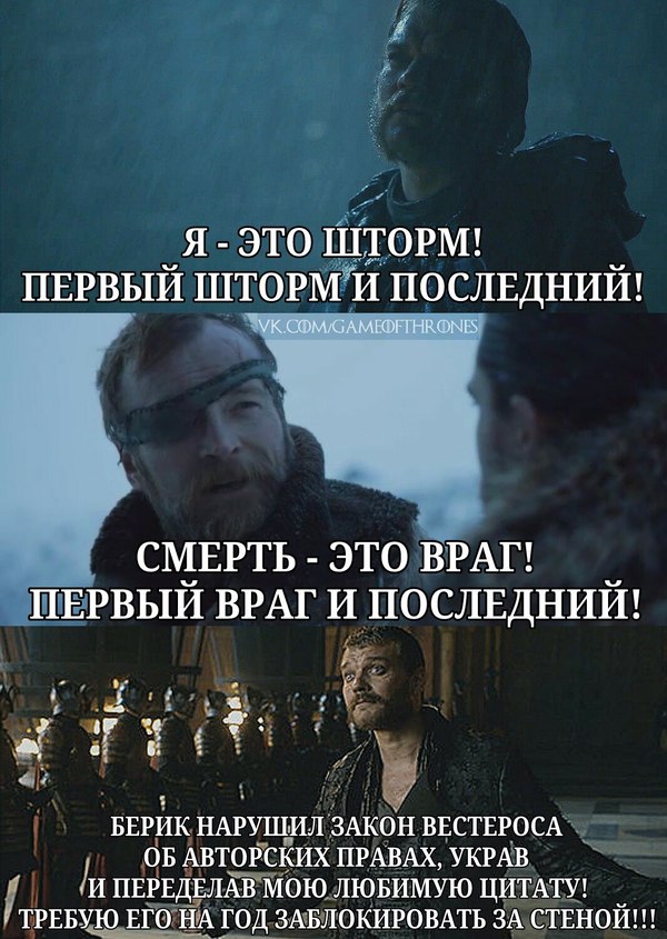 >>586846 >манярассуждений Я всего лишь указал на тот очевидный факт, что причиной Танца послужили личные амбиции - как со стороны Зеленых, так и со стороны Черных. А вовсе не то, что Рейнира мол нарушила ДРЕВНИЕ АНДАЛЬСКИЕ ПРЕЦЕДЕНТЫ (на которые в Вестеросе все плевали). Если уж говорить про Вестеросские традиции, то там единственная уважаемая и ключевая традиция, на которой стоит все государство и весь континент - это верность сюзерену. А вот выбирает себе сюзерена каждый сам, по вкусу и возможности, лол. >Рейгар Рейгар тут причем? Рейгар ставил выше государства не личные амбиции, а скорее всего пророчество, которое требовало родить обещанного принца конкретно от Лианны Старк, >Эйгон Опять же Эйгон Завоеватель тут причем? По ДД его вели не личные амбиции, а cнова то же самое пророчество. В мартэномирке отнюдь не все ставят личные амбиции выше долга, но некоторые путают долг и личные амбиции, также как ИРЛ.