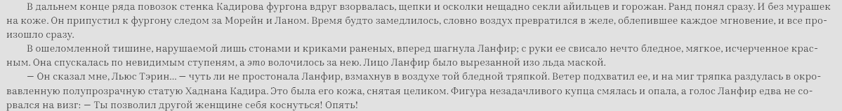 >>584517 Ах да, там еще четверть книги Эгвейн сидит в лагере у стен белой Башни, и где-то 10% отдано тому, как Илейн пытается править. Ранда покажут только в эпилоге (главному герою цикла дали два процента книжки, охуеть). Но почему "Нож сновидений" оценен настолько выше, мне не ясно. Там, кончено, начался хоть какой-то движ, но всё еще не фонтан. Видимо на контрасте после "Перекрестка".