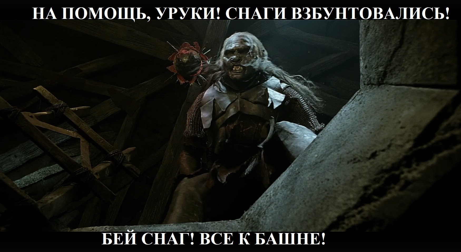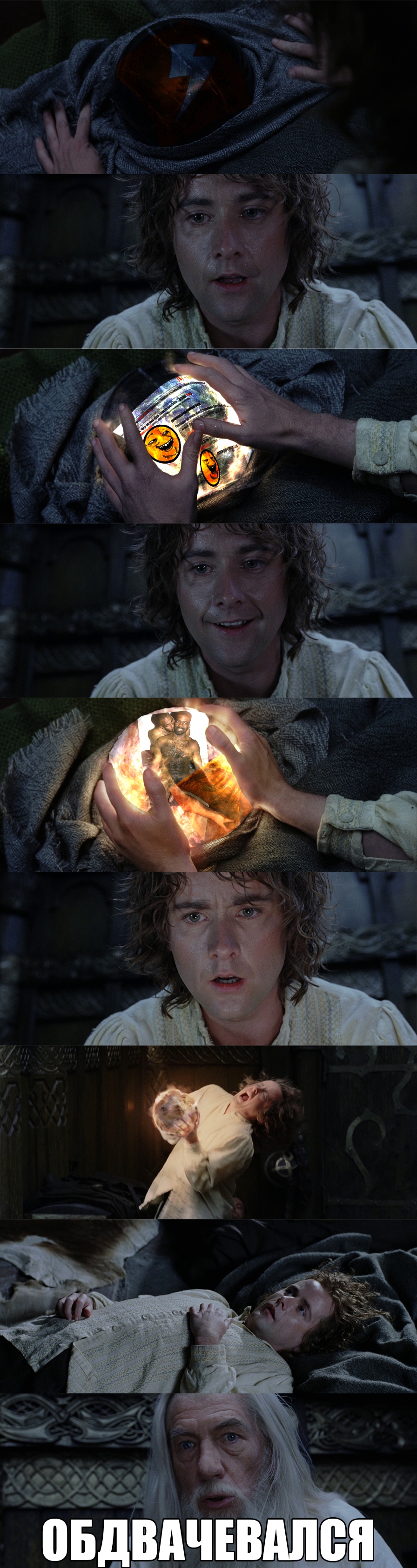 Я тебе принес покушать, пожрать, в тюрьме не кормят вообще… пожрать-то, покушать хлебушка хотя бы… ЭТО ЛЕМБАС, ЭТО ХЛЕБ!!! — Уйди отсюда от меня, уйди! УЙДИ, Я СКАЗАЛ, БЛЯДЬ!!! — Эльфийский хлеб! — Уйди, я сказал, поставь тарелку, блядь, иди мойся, пидорас, блядь, убью нахуй. Сука, бляядь! Как ты доебал меня! — Лембас!.. Я лембасом сру, блядь! — Фу-у, блядь! Всё засрал, блядь, а! Уф, блядь, какой вонизм, а! — Хотел дружить с тобой... дружба, покушали… Покушаем вместе, давай покушаем, посидим хоть, поговорим!.. — Весь в говне, блядь, а, весь в говне, а! Нахуя ты говном-то выма… — Я не срал сегодня вообще! — Уйди нахуй от меня, блядь, не подходи, я сказал! Убери тарелку эту, блядь! — Я просто покушать принёс… — Уйди отсюда, блядь! — Покушать… — Уйди! — Просто покушать принёс тебе… ты бы покушал хоть, когда усталый!.. Покушать принёс чуть-чуть еды, это эльфийский хлеб!.. — ИДИ МОЙСЯ, НАХУЙ, БЛЯДЬ!!! ИДИ, СУКА, МОЙСЯ! — Пидор… я не пидор… — Блядь… сука, мудак, блядь! Уааа! Иди мойся, блядь, мойся, мойся, нахуй! Мой, блядь, пузо своё… тощее, блядь! — Эх! Эх, вот в пещерах-то было всё! Ты в пеще… — Фарамир, бля, уберите от меня этого мудака!!! — В пещерах гоблины ели всё, это самое, не тока! — Чё ели? Ты чё, мудак что ль, кто ел-то, блядь? — Мой лембас ели! — Лембас ели, но говно-то не жрали! Ты чё, с ума сошёл, ёпта? Совсем дошёл, бля! Мойся, я сказал! — Лембасом покормили… — Мойся, туда иди, мойся, блядь. — УАААААААААААААААААААААААААААА ААААААААААААААААААААААААААААААА ААААААААААААБЛЯЯЯЯЯЯЯЯЯЯЯЯЯЯЯЯЯЯЯЯЯЯЯЯЯЯДЬ СУКАААААААААААААААААААААА АААААААААААААААААААААААААААА АААААААААААААААААААААААААААААААААА аааааааааааааааа, сука, сука, сука, сука.