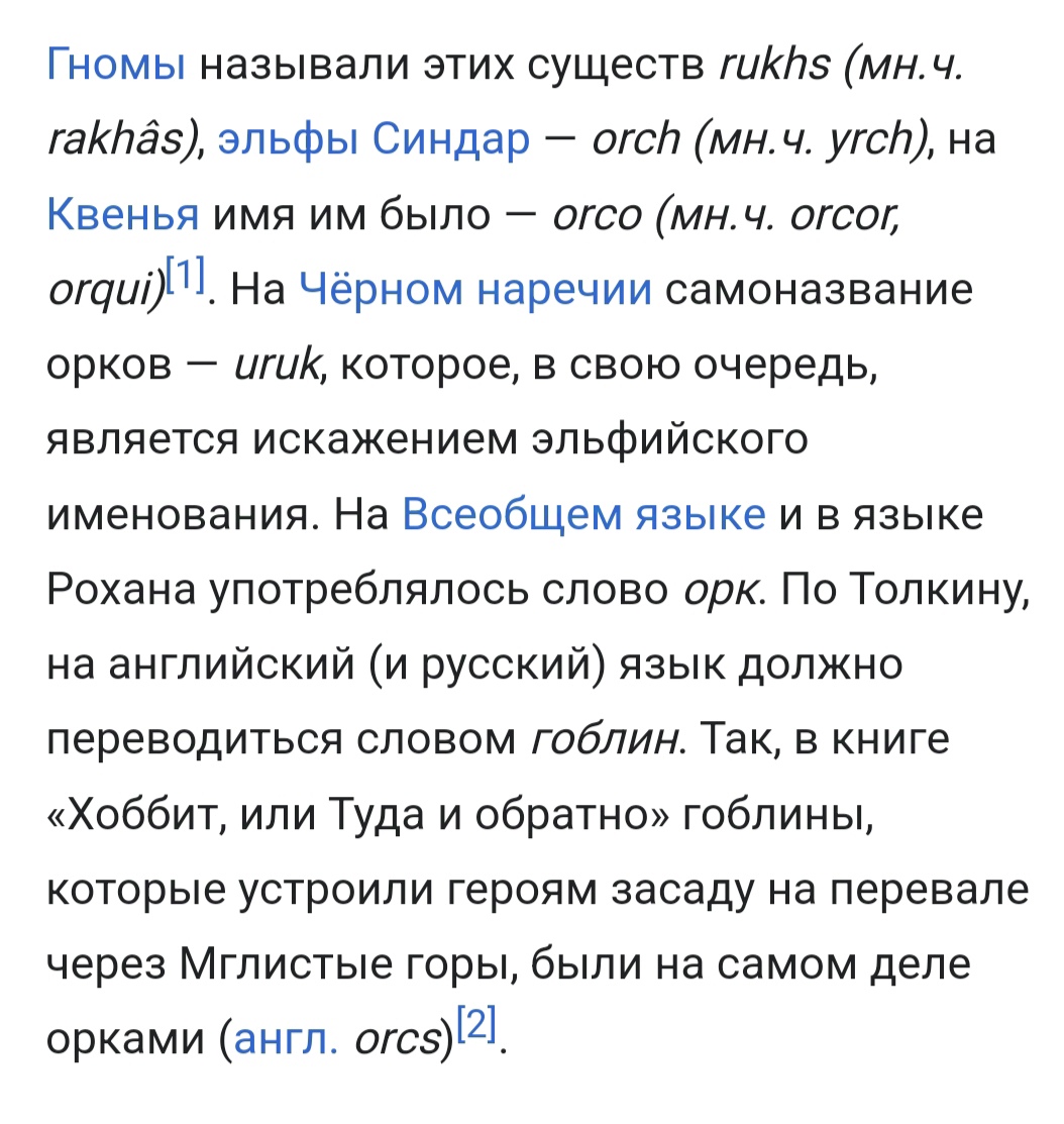 >>587708 Гоблины у Толкина это то же самое что и орки. Это не отдельная раса. В Хоббите гоблинами называют орков Мглистых гор. В ВК слово гоблин иногда используется как синоним слова орк.