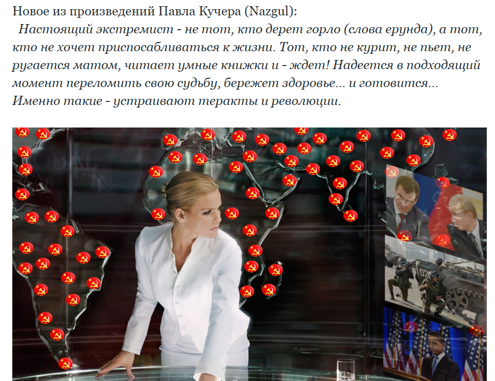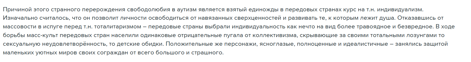 Если же говорить более широко, в целом про творчество АбПокоя ну смотри первые две рандомно выбранные цитаты из ЖЖ, везде он бухтит что плохо быть либералом, надо слушаться начальника, коллектив лучше знает, в коллективе сила. Для человека, который вырос в постсовке это очевидный триггер.