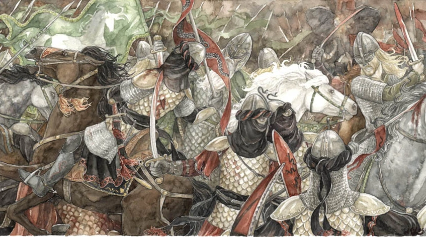 «И вот вождь оглядел поле, и в свете утра увидел стяг Теодена, обогнавшего свое войско, и заметил, что рядом с Теоденом – лишь горстка конников. Воспылав яростью, харадец издал громкий клич и, приказав развернуть знамя, где извивался на кроваво-красном поле черный змей, ринулся в атаку на Белое и Зеленое, а за ним – его воины. Ятаганы харадцев засверкали, как тысяча звезд. Теоден увидел южан и, не дожидаясь нападения, направил Снежногрива им навстречу. С великим грохотом и лязгом сшиблись всадники, но белая ярость северян превозмогла багровую злобу южан, да и военным искусством конники Теодена владели лучше – длинные роханские копья били внезапно и точно. Рохирримов было меньше, но они прорубили себе дорогу в строю харадцев, словно просеку среди стволов, и в самом центре сечи бился Теоден, сын Тенгела. Его копье пронзило вражеского вождя и треснуло, но король выхватил меч и, взмахнув им, одним ударом разрубил древко знамени и тело знаменосца-южанина. Черный Змей пал. Оставшиеся в живых конники Харада обратились в бегство».