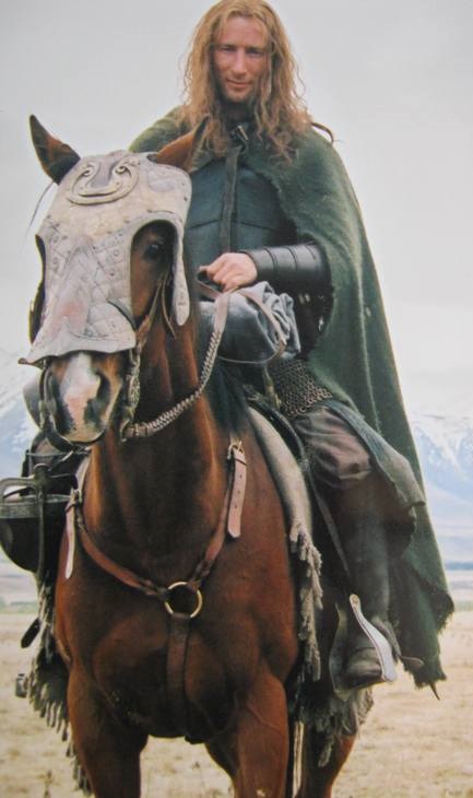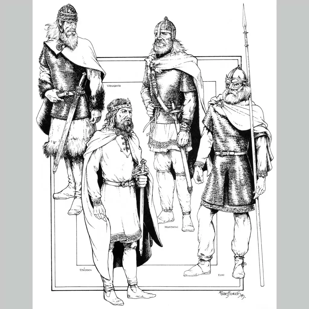 Брего, сын короля Бальдора, чье тело нашли Арагорн и его спутники, был облачен в позолоченную кольчугу (gilded hauberc), перепоясанную отделанным золотом поясом и темно-красными камнями. Шлем также был украшен золотом. Князь был вооружен длинным мечом. Стражники у ворот Эдораса были вооружены копьями и облачены в кольчуги. Стражники Золотых Палат сидели при входе с обнаженными мечами, рукоять которых была украшена зеленым драгоценными камнями (green gems). Кроме того, они имели при себе зеленые щиты с изображенным на них солнцем (sun was blazoned upon their green shields) и были облачены в длинные сверкающие доспехи (long corslets, burnished bright). Наиболее вероятно, что этими доспехами были кольчуги, однако не исключен и иной тип доспеха. На момент описания стражники были без шлемов, однако вероятнее всего, что их просто сняли. Позже один из стражников приносит шлем, полный воды, чтобы смыть плевок Гримы (это, кстати, говорит о том, что шлем не был ламеллярным). В королевской оружейной хранились шлемы и кольчуги гондорской работы (helms and coats of mail), щиты, украшенные красными, зелеными и белыми драгоценными камнями, с золотым умбоном. Гимли достался небольшой щит с гербом Эорла: белым конем на зеленом поле, (который Теоден носил в детстве) и легкий кожано-металлический шлем (cap of iron and leather). Меч Эомера, Третьего Маршала Марки назывался Гутвинэ (Gúthwinë). Его вооружение не отличалось от вооружения остальных всадников, за исключением шлема с украшением в виде конского хвоста. Роханские всадники (эоред Эдораса) были облачены в легкий кожано-металлический шлем, длиннополую кольчугу-хауберк из колец мелкого плетения. Кроме того, они носили большие, расписанные красками миндалевидные щиты с умбоном и были вооружены длинным мечом и длинным ясеневым копьем. Когда заходит речь о вооружении Мериадока, Эомер упоминает легкий шлем (lighthelm) и сожалеет, что для воина нельзя найти подходящий меч и кольчугу (mail).