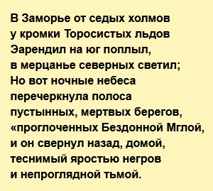 И если, начав с высокого и прекрасного, повествование завершилось мраком и разрушением, то такова издревле судьба Арды Искаженной; а изменится ли что-нибудь и придет ли конец Искажению, знают, быть может, лишь Манвэ и Варда; но они никому не открыли того и не сказали о том в пророчествах Мандоса.