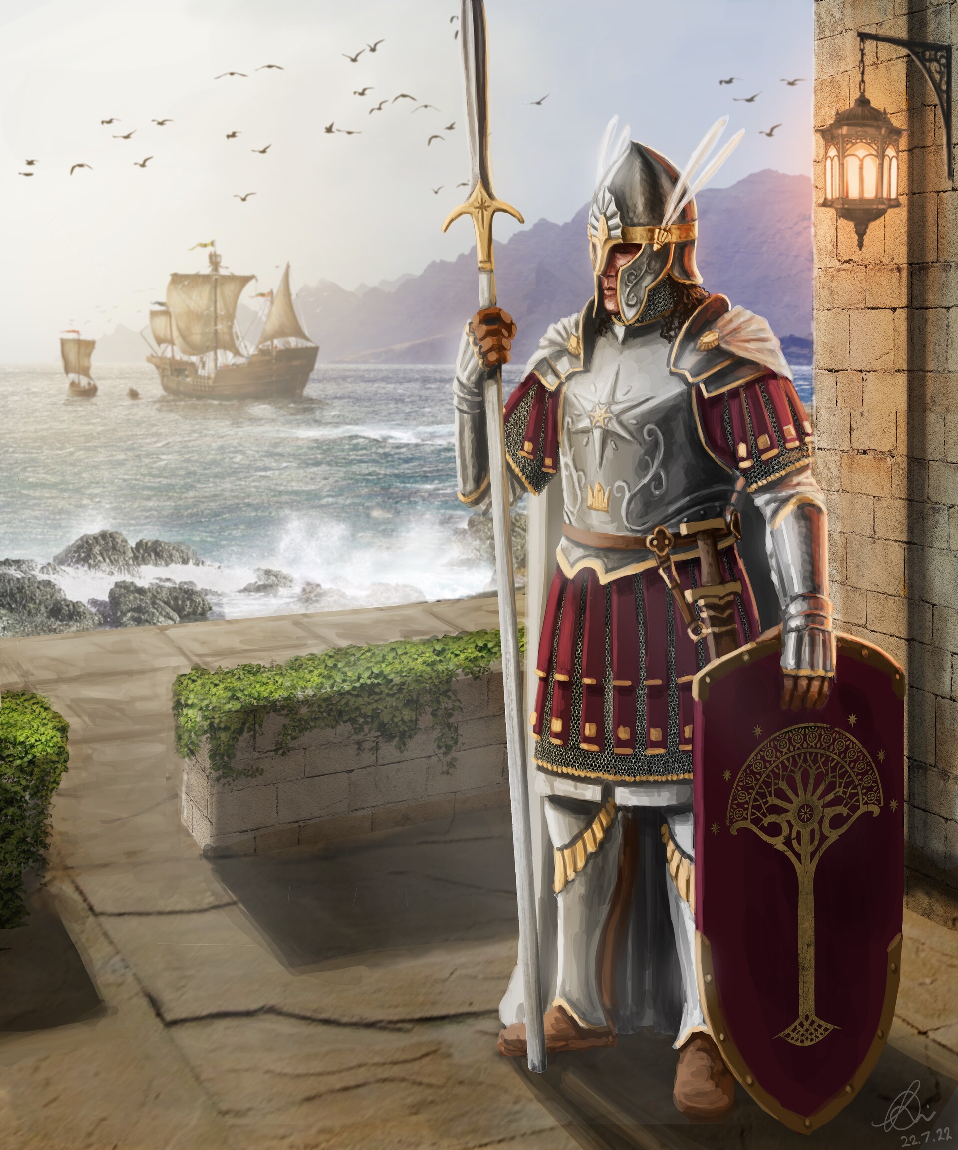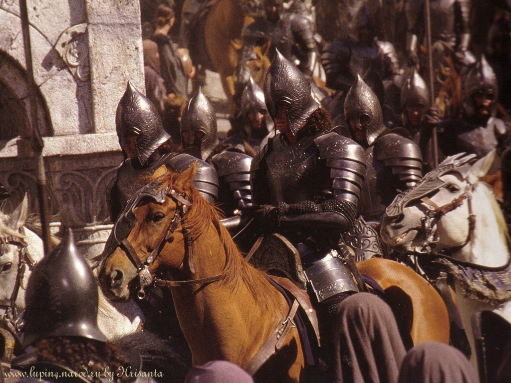 Стражи Цитадели вооружались копьями и мечами, носили вороненые (yet black as jet) стальные кольчуги (hauberk), с длинными полами и рукавами. Головы их были защищены «странной формы» (strange shape) высокими (high-crowned) шлемами из митриля, с длинными нащечниками. Шлемы были украшены чаячьими (sea-birds) крыльями из белого металла. Шлем, выданный Перегрину, был украшен крыльями ворона (raven-wings); возможно потому, что вооружение разных отрядов гвардейцев Цитадели не было абсолютно одинаковым. Кроме того, на шлеме была маленькая звезда, вписанная в круг. Что интересно, на хоббита был найдена кольчуга (hauberk) по росту! Поверх доспеха он носил черное сюрко (surcoat). На груди было вышито серебром Белое Древо. Облачение Стражей восходило ко временам Элендиля, то есть не менялось в течении всей Третьей Эпохи. Имрахиль, Князь Дол Амрота, был одет в кольчугу и носил полированные латные наручи (vambrace); к сожалению, характер прочих доспехов не известен. Рыцари Дол Амрота были «рыцарями в полном вооружении» (company of knights in full harness). Судя по описанию аналогичных войск (ср. описание нолдор, роханцев, речи Имрахиля и Гэндальфа на Совете), они были вооружены длинными копьями, мечами и щитами, носили кольчуги, шлемы и возможно наручи с поножами.