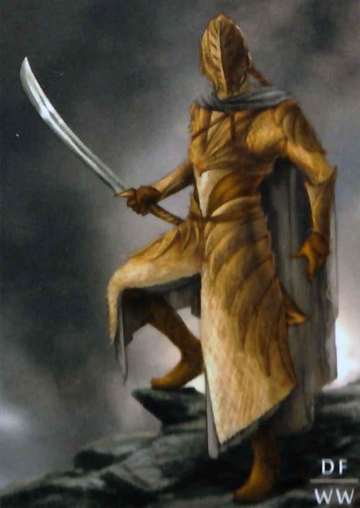 М-да... художники такие художники. Нет, чтобы прочесть описание доспехов и оружия эльфов из книги, так нет, рисуют всякую хрень. Так сложно изобразить высокого статного воина в кольчуге или чешуе, с миндалевидным щитом и сфероконическим островерхим шлемом? Мечи у эльфов нормальные, прямые, а не греческие махайры.