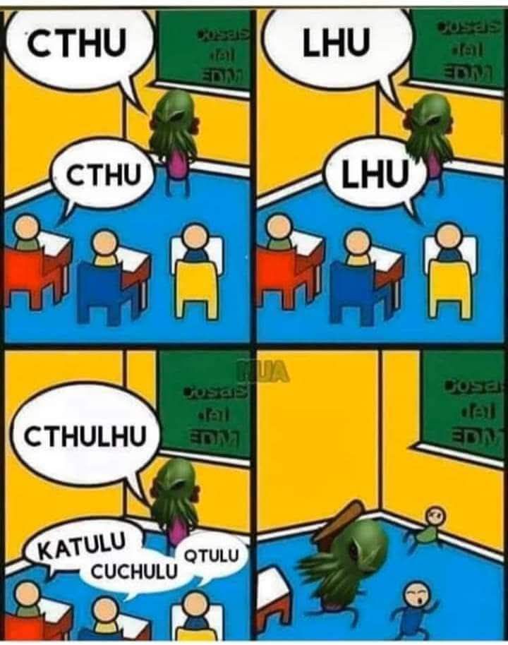 >Лавкрафт не любил описывать неописуемое, когда что-то такое появлялось или звучало, он не пытался вдаваться в подробности Что говорится в статье: >Lovecraft transcribed the pronunciation of Cthulhu as Khlûl′-hloo, and said, "the first syllable pronounced gutturally and very thickly. The 'u' is about like that in 'full', and the first syllable is not unlike 'klul' in sound, hence the 'h' represents the guttural thickness" yielding something akin to /ˈq(χ)lʊlˌɬuː/. Ты обоссан два, потому что Лавкрафт вдался в подробности и описал, как это звучало.
