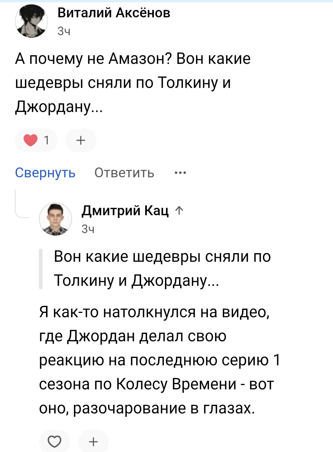 Бтв хз где тебя забанили, но в двух самых живых группах вк 80% комментов от хейтеров сериала. Причем большинство в стиле мувимейкера: лишь бы что-то спиздануть, при этом не зная книг. Самый простой пример – извергающаяся драконова гора, челы как только увидели сериальный Тар-Валон пишут: аррря авторы дебилы это гора, а не вулкан. На фоне таких дегродов невольно начинаешь защищать сериал