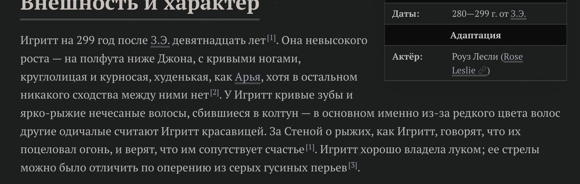 >>600649 > Ну если они про Жона Коннингтона то да, а так кому не похуй на мнение соевиков и жирух Да это скорее просто мемный пост. Так то Джона вряд ли бисексуалом дед сделает лол, но вообще ты должен учитывать, что в понимании Мартина бисексуальность это ни разу не отрицательная черта, ничего постыдного он в этом не видит, так что вполне может своих героев такими делать. Вон у Дейенерис был опыт с девочкой. Правда ей не особо понравилось. >что Тирион "темный" Так и есть. Это значительно менее положительный персонаж чем в сериале. >или и вовсе язык отрежут(вообще удивляюсь как это взялось и распространилось На самом деле это годная теория. Намеки и правда есть, по крайней мере это можно трактовать как намеки. Но я не верю в нее по другой причине - чтоб Мартин и так поступил со своим любимцем? Не, вряд ли. >>600656 Там ещё прикол в том что Принцесса и Королева запараллелена с основной сагой, дед много спойлеров выкинул, как многие считают, а в конце Принцессы и Королевы у сломанного мальчика-короля как раз изувеченный десница Ланнистер.