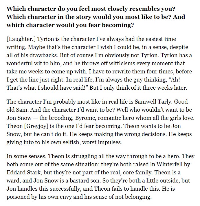 >>600738 Ты сам читал целиком, то что скинул? Почему, по мнению Жирного, Джон молодец, а Теон неоче? Потому что: >So they’re both a little outside, but Jon handles this successfully, and Theon fails to handle this. He is poisoned by his own envy and his sense of not belonging.
