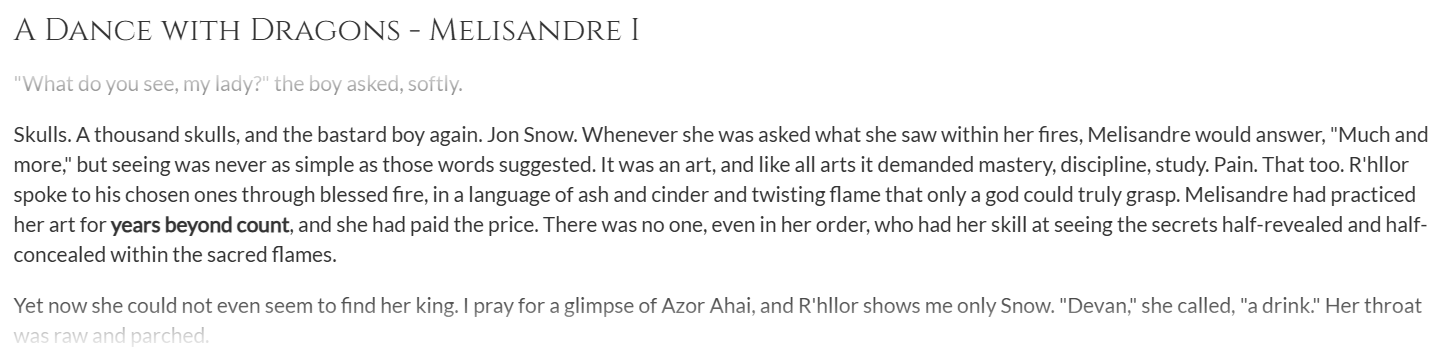 Мелисандра может взять Жона Тарга и сжечь дотла, и родить себе 100 дракончиков, снести Стену и побрать всех Иных самолично, вообще похуй, мне интересно как там у Сноу дела.