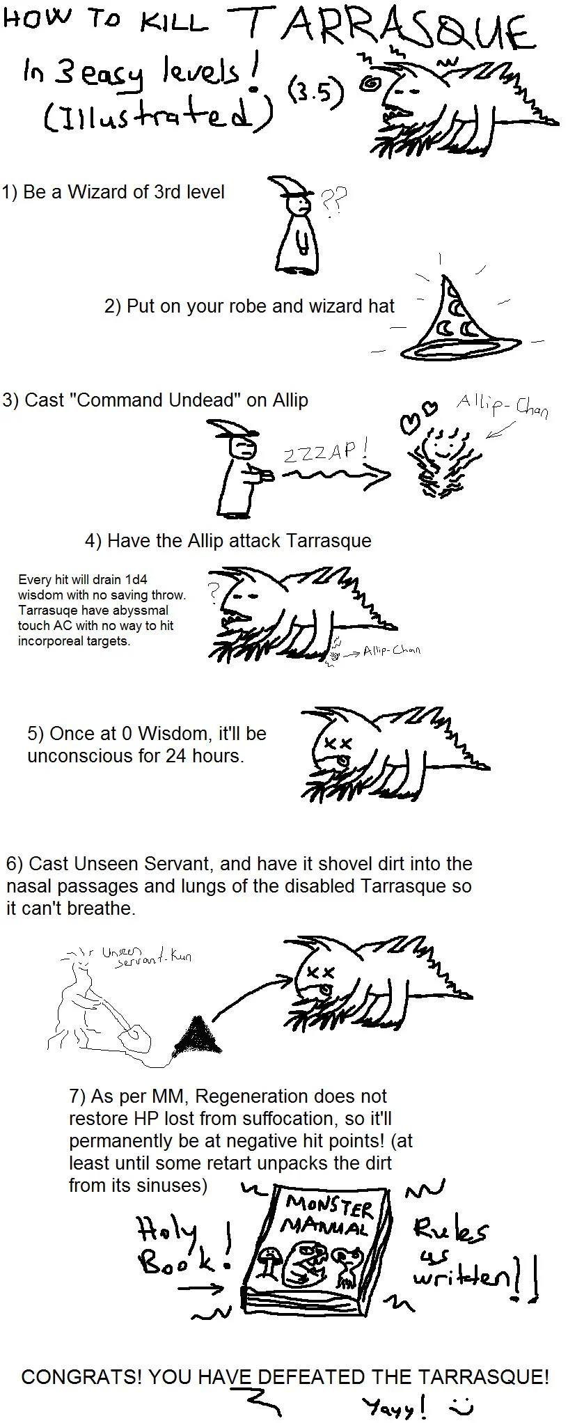 >>602057 >Любой дындешный иллюзионист. У машины показатель мудрости будет болтаться в районе нуля, а заклинания школы иллюзии ебут непосредственно разум, игноря броню и прочие меры защиты. На самый крайний случай такой мудила будет сидеть вообще недосягаемым в другом плане, и доебывать вещими снами превращенными в дамажащие кошмары. Напомнило знаменитый метод победы над тарраском при помощи мага третьего уровня, подчинённого привидения и лопаты с землёй. Особые ценители рекомендуют впоследствии заменить землю расплавленным металлом, чтобы выведение тарраска из строя стало более перманентным.