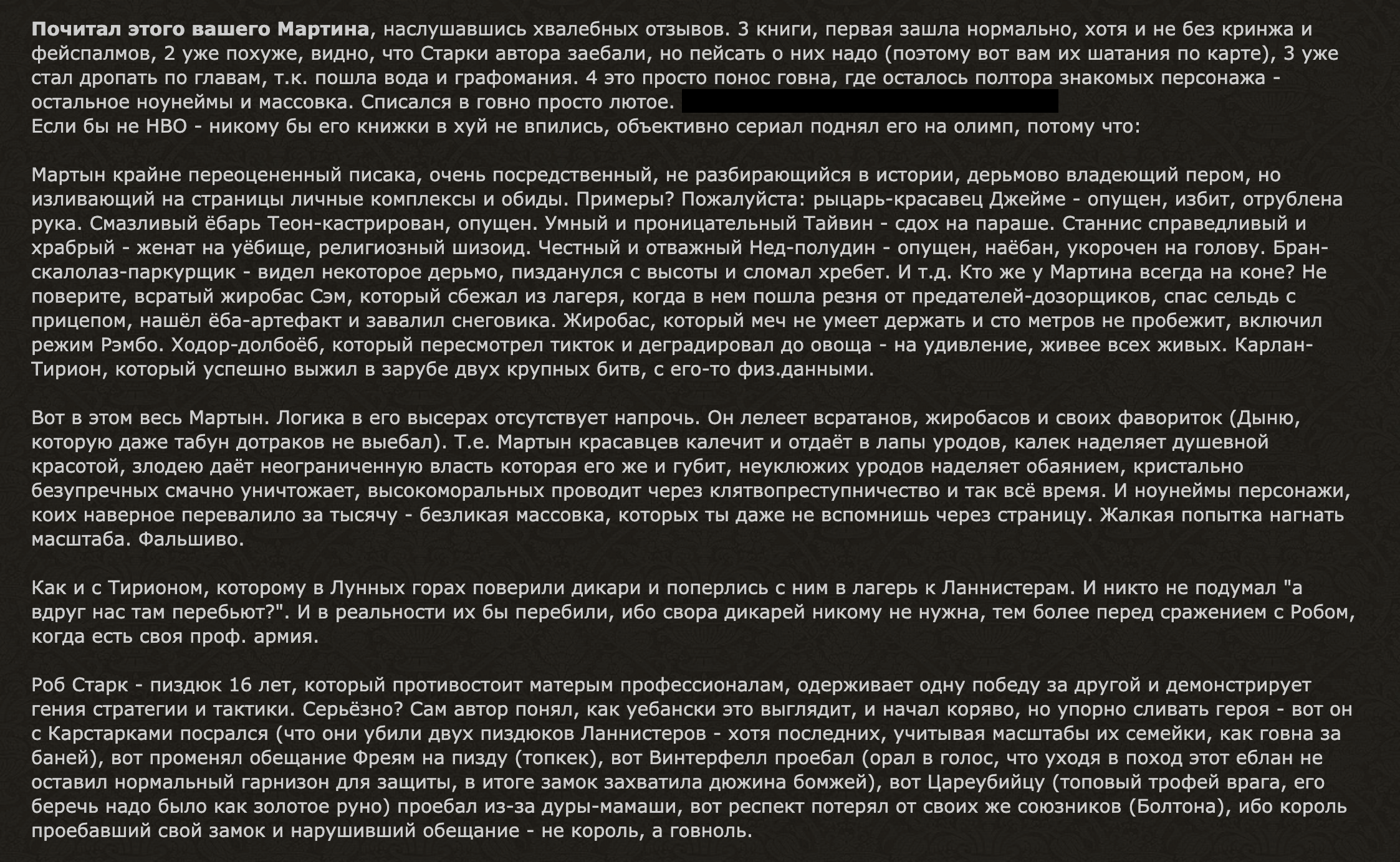 Прежде чем писать глупые вопросы, прочти пояснение: 1) Этот тред НЕ по сериалам Игра Престолов и Дом Дракона. 2) Этот тред НЕ ТОЛЬКО по Песни Льда и Пламени, в частности, не только по её основному циклу. Можно обсуждать и другие произведения автора (хотя этого практически никто не делает).