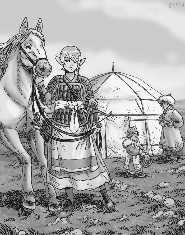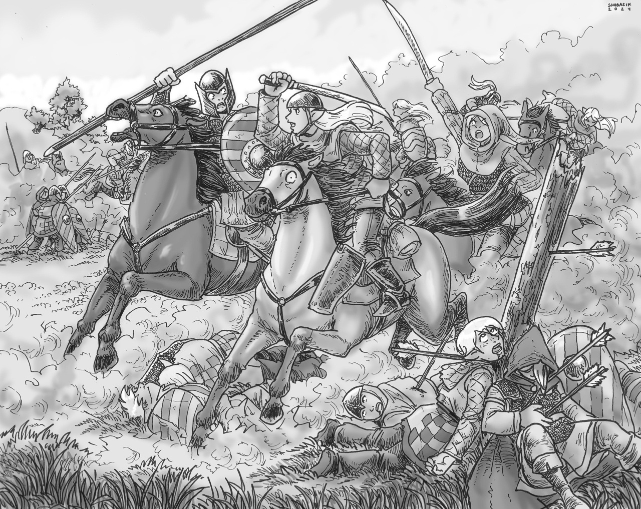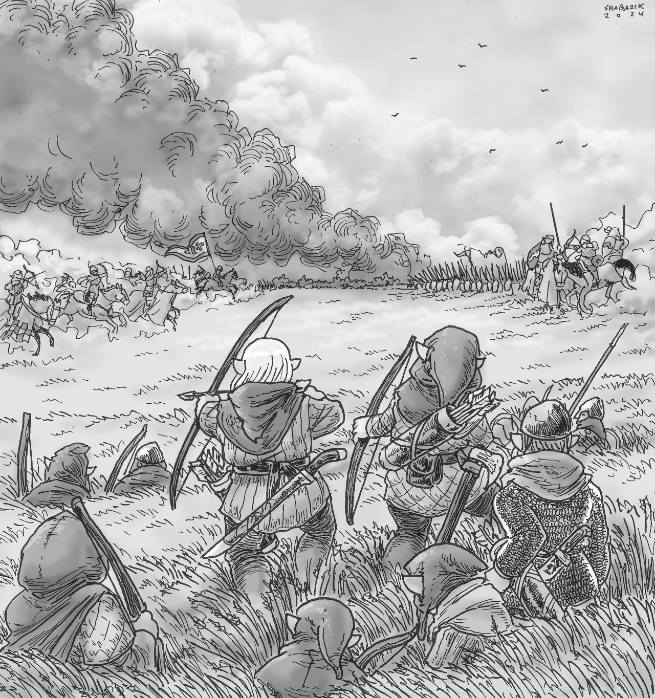1. Кочевник-эльф с головным убором в половецком стиле. 2. Эльфийские вспомогательные силы Голиатской Империи сталкиваются с герцогскими эльфийскими вспомогательными войсками Шабии. 3. Рейд у приграничного города в Голиатской Империи. Сожжён эльфами и отбит наёмниками. 4. Война, конные лучники Баронства атакуют линию Герцогства. В высокой траве засада лучников и застрельщиков.