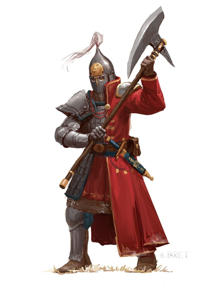 >>609280 Во, это интересно. Варяжская гвардия византийской империи. Профессиональные наемники из далёких стран. Вроде бы не самый частый гость в фэнтези, где все стараются обходится собственными силами. А уж нанять целую гвардию из иностранцев или инорасцов, это редкость. Хотя странно. Можно было бы обыграть, почему у эльфийской знати гвардия из гномов либо людей. Как и обратные варианты, когда эльфы идут в наемники к людям либо к гномам.