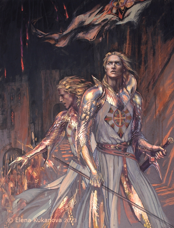 >>611594 Это один из обликов Саурона и некая чародейка-оборотень из народа орочек. Летний погожий денек когда-то в бесконечной дали Первой эпохи. Тишина и ленивое спокойствие, даже трубы Тангородрима не так уж дымят.