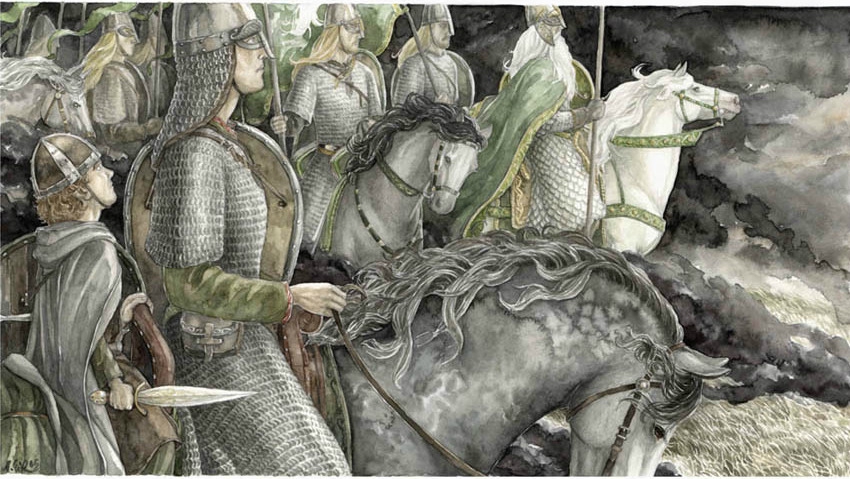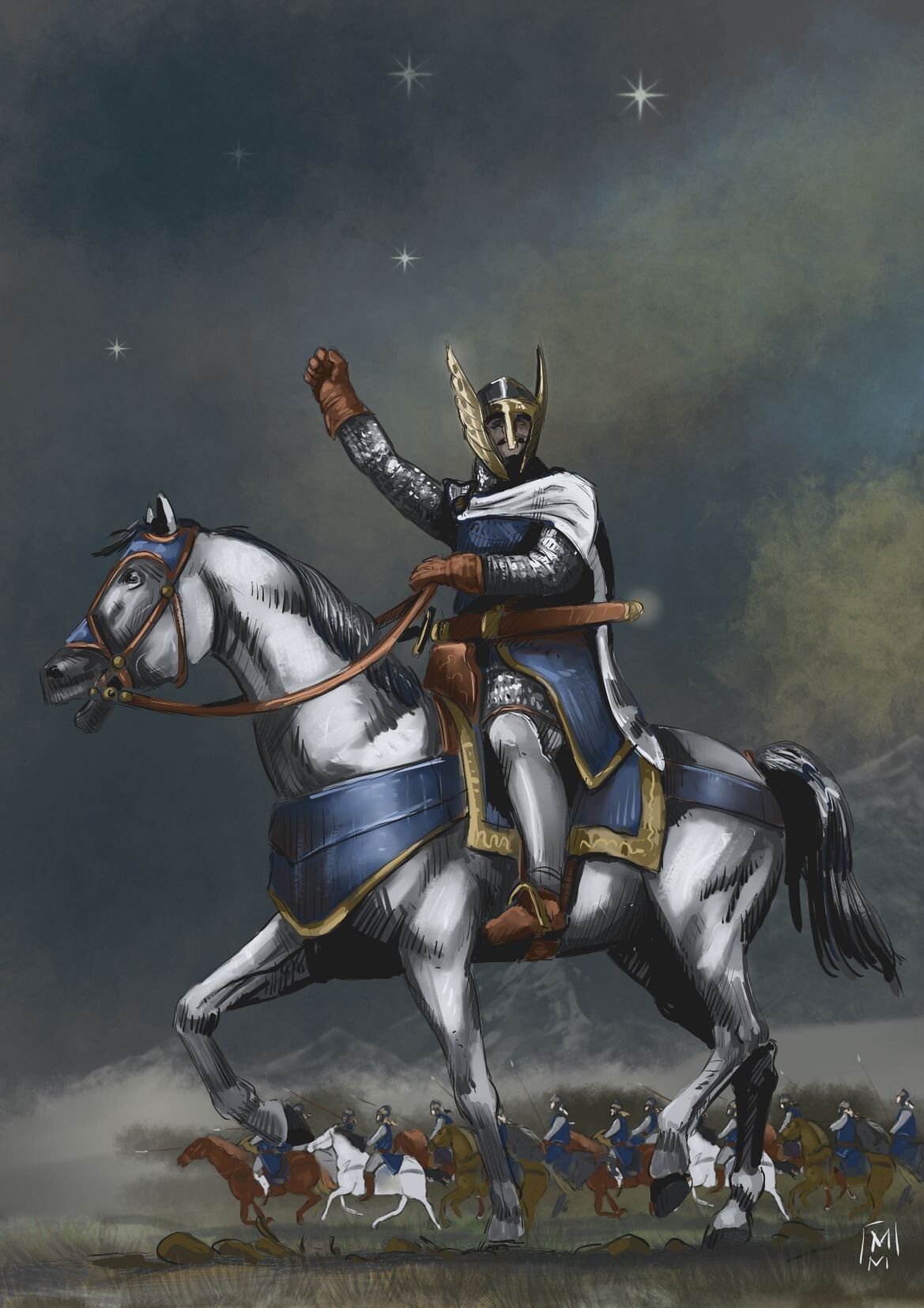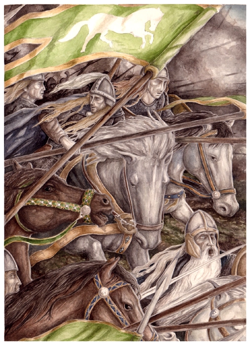 >>616993 Their horses were of great stature, strong and clean-limbed; their grey coats glistened, their long tails flowed in the wind, their manes were braided on their proud necks. The Men that rode them matched them well: tall and long-limbed; their hair, flaxen-pale, flowed under their light helms, and streamed in long braids behind them; their faces were stern and keen. In their hands were tall spears of ash, painted shields were slung at their backs, long swords were at their belts, their burnished skirts of mail hung down upon their knees.