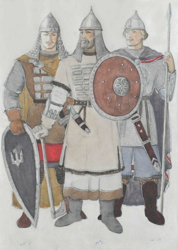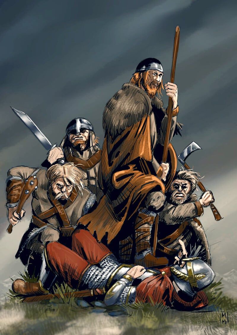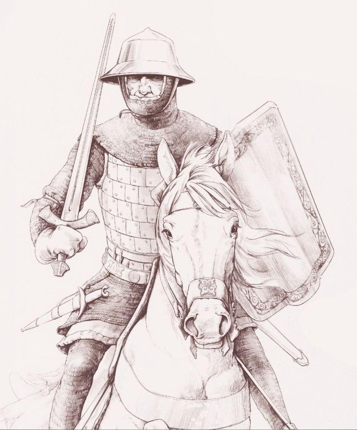 Лошади были крупные, сильные и породистые; их серая шерсть блестела, длинные хвосты развевались на ветру, а гривы были туго заплетены. Всадники были им под стать: высокие, с длинными ногами и руками; их волосы, бледно-желтые, выбивались из-под легких шлемов и были заплетены в косы; лица их были строги и серьезны. В руках они держали длинные копья из ясеня, раскрашенные щиты были заброшены за спины, а на поясе у каждого висел длинный меч, они были одеты в сверкающие кольчуги до колен.