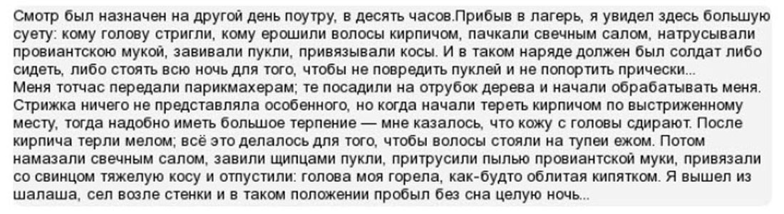 >>613941 Головы прусских солдат, как потом по образу и подобию и российских, украшали собственные волосы, уложенные специальным образом с помощью подручных средств - по одному локону над висками, а сзади - косица, которая завивалась вокруг железного прута. Причем полный парад на головах служивых даже в прусской армии наводился только в торжественных случаях - парад, смотр или богослужение.