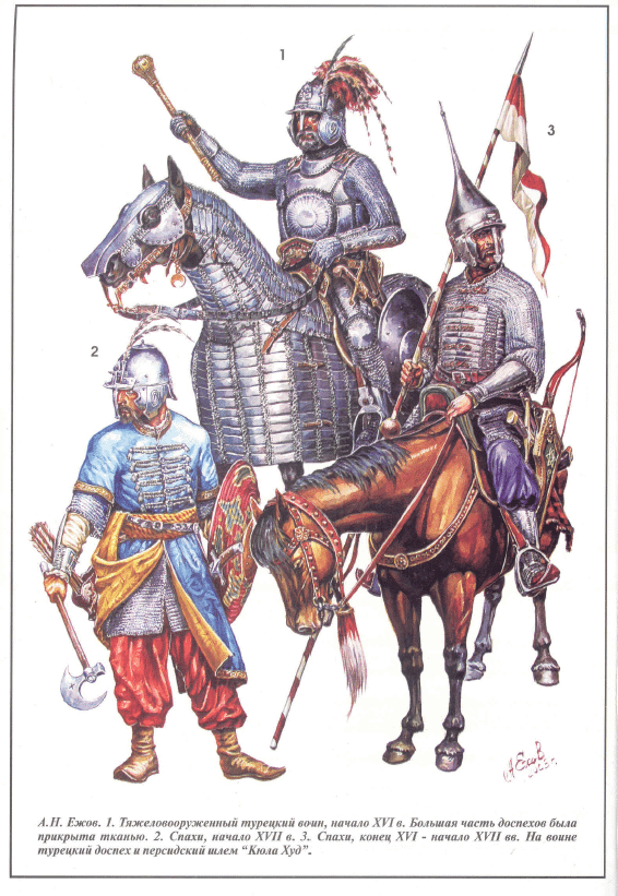 «Конница из более знатных и богатых одевается в панцири из тонких и хорошо закалённых металлических пластинок и островерхий шлем, равным образом сделанный из пластинок; причём всё это производится в Персии. Эти (конники) в большинстве действуют копьём, прочие же все вместо лат носят толстые (стёганные) кафтаны, очень плотно набитые хлопком, они часто противостоят ударам, особенно стрелам. Среди них есть большой отряд аркебузеров, а все другие действуют луком. Общим для всех оружием является меч и кинжал, а немногие выделяются железными палицами. Лошади у них малорослые, но весьма приспособлены к (воинскому) труду и всяким невзгодам, а сверх всего и к холоду» Франческо Тьеполо (1560 г.)