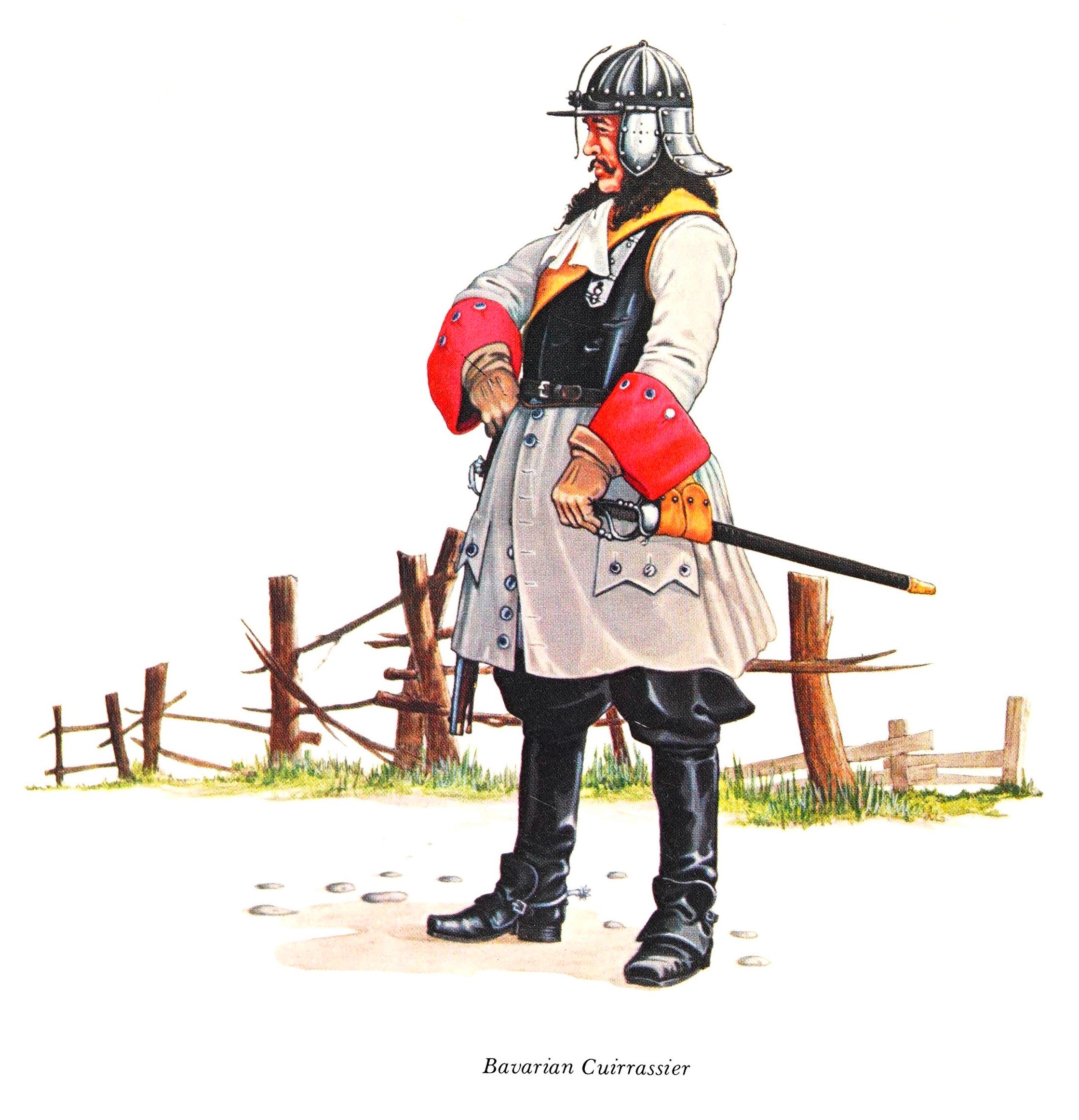 Интересно также то, что пишет Графф о кирасирах: «При этом непрерывном марше и нахождении в поле почти летом и зимой, все кирасирские доспехи больше обременительны, чем полезны для простых солдат, тем более, что больше нет необходимости в различии между кирасирами и аркебузирами на службе. По этой причине несколько полковников уже начинают разрешать носить только заднюю и переднюю части кирасы, вместе с кавалерийской курткой, и также приобрели хорошие карабины, которые, безусловно, являются хорошим и полезным оружием для кавалериста. Если Ваше Высочество пожелает, чтобы это было в вашем полку, или если рота должна иметь по крайней мере 20 карабинов, я хотел бы ввести это в практику. Это имеет очень хороший эффект при атаке и отправке на рейды, особенно в нынешние морозы и холодную погоду (потому что у некоторых есть старая крестьянская шуба, у других на теле бельц (мех), бразаллен (доспехи с железными перчатками) не следует носить, их разбирают на части в мешок на лошади (вьюк) и их нельзя снова собрать и надеть из-за нехватки времени, человек и лошадь только обременены ими».